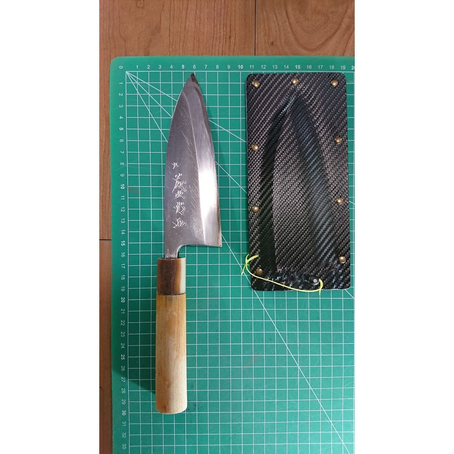 1. o1288/銘:藤次郎/出刃包丁(片刃)/刃長:150/峰厚 アゴ上:6.8/重量:222/作り:白紙鋼?/他:当社自作の丈夫で軽いサヤ(カイデックス素材)付き