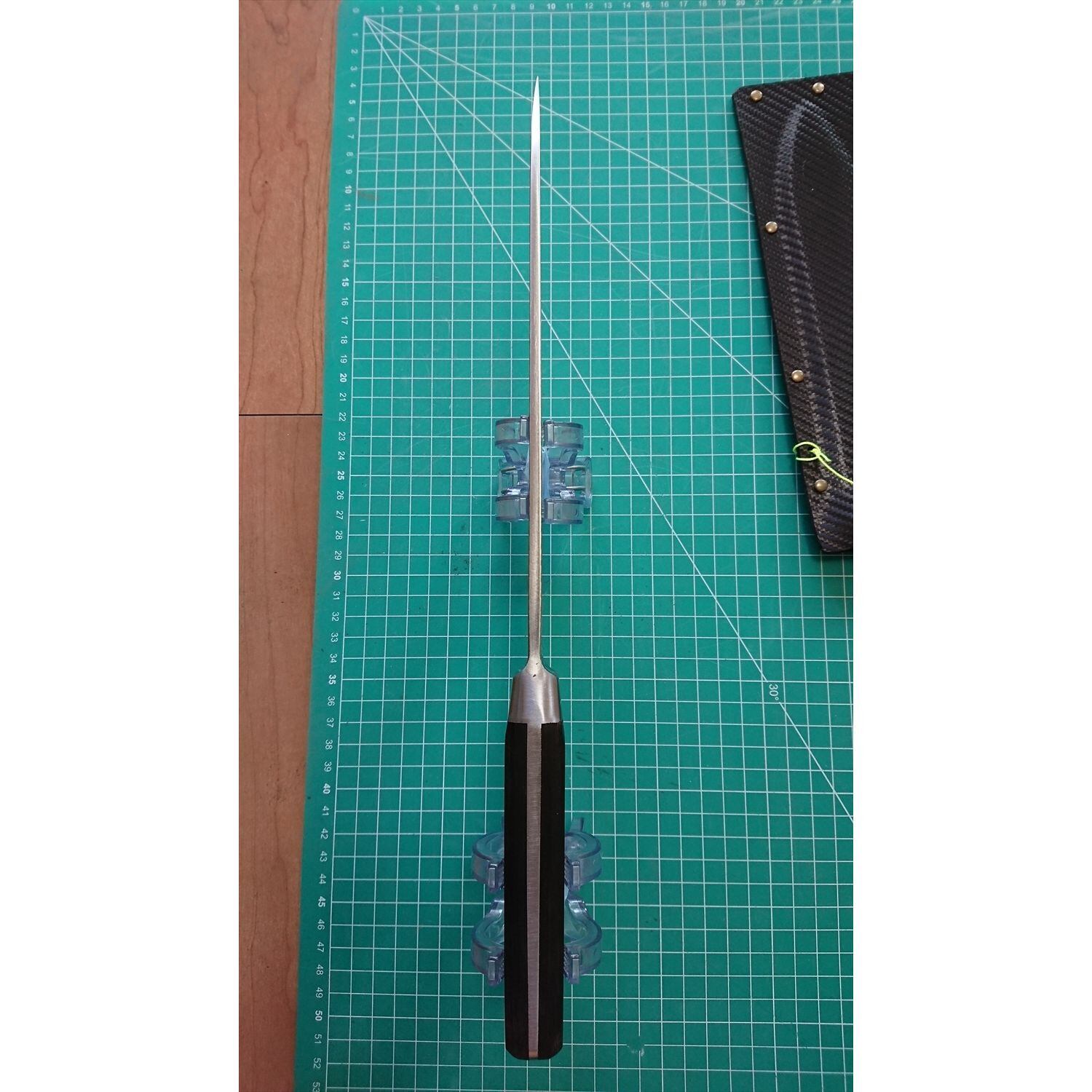 1. o1221/銘:堺正守/洋出刃包丁(両刃)/刃長:210/峰厚 アゴ上:4.6/重量:358/作り:鋼?/他:当社自作の丈夫で軽いサヤ(カイデックス素材)付き。写真内の箱付き