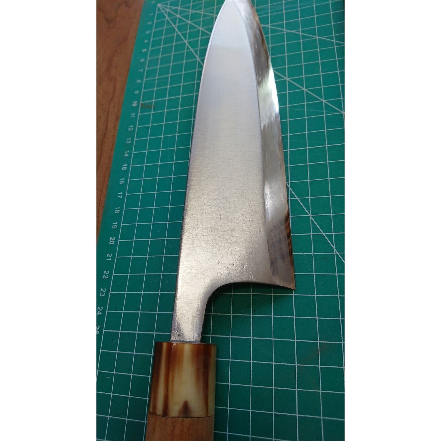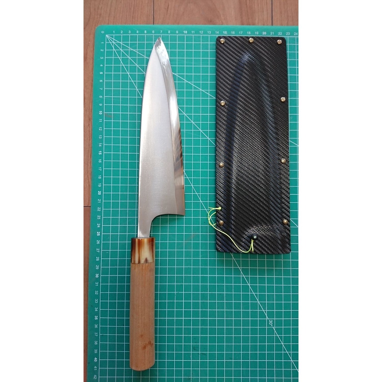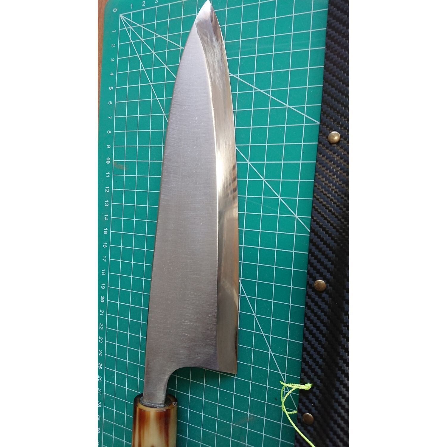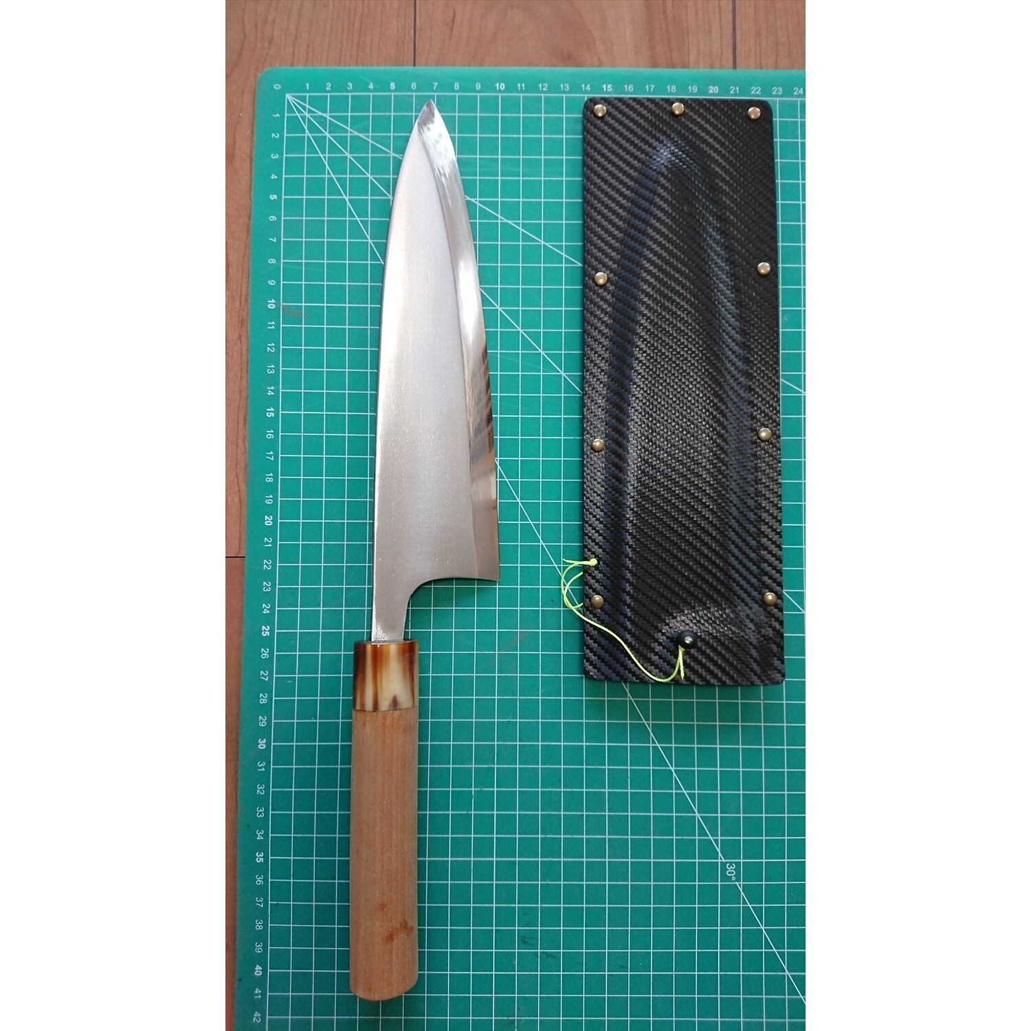 1. o1266/銘:正本 ○秀/出刃包丁(片刃)/刃長:225/峰厚 アゴ上:7.7/重量:393/作り:鋼?/他:当社自作の丈夫で軽いサヤ(カイデックス素材)付き。口輪に一部ヒビがあったが当社にて補修済み