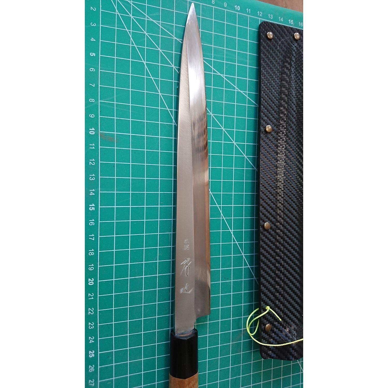 1. o1287/銘:本銘房近/刺身包丁(片刃)/刃長:230/峰厚 アゴ上:3.3/重量:129/作り:白紙1号 本水牛柄/他:当社自作の丈夫で軽いサヤ(カイデックス素材)付き。写真内の箱(汚れ、破れあり)付き