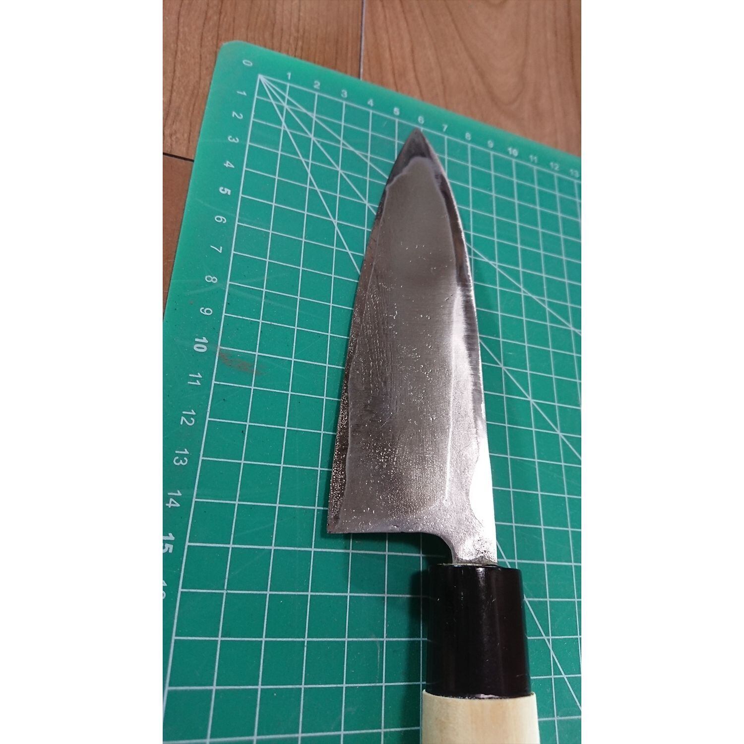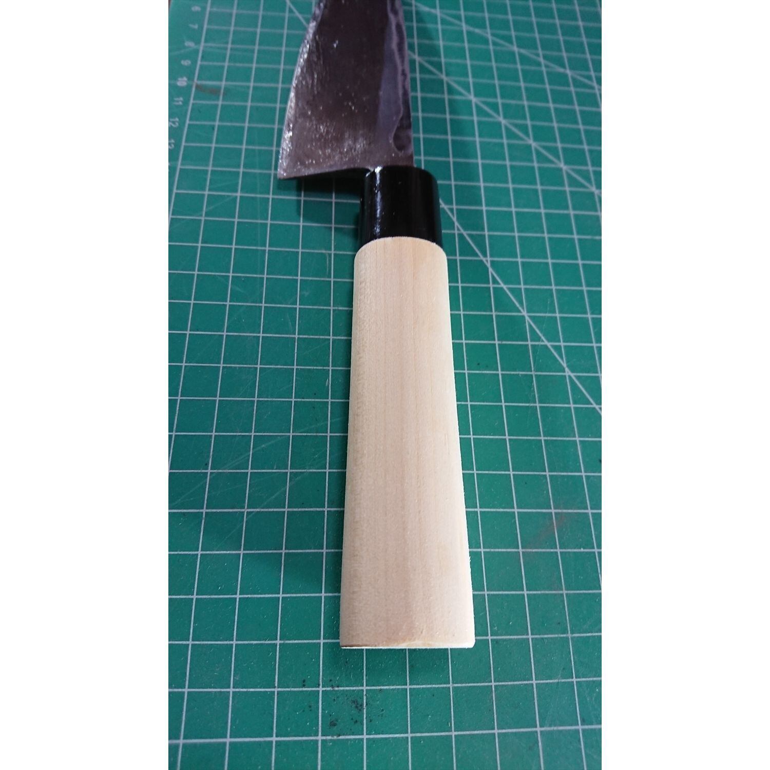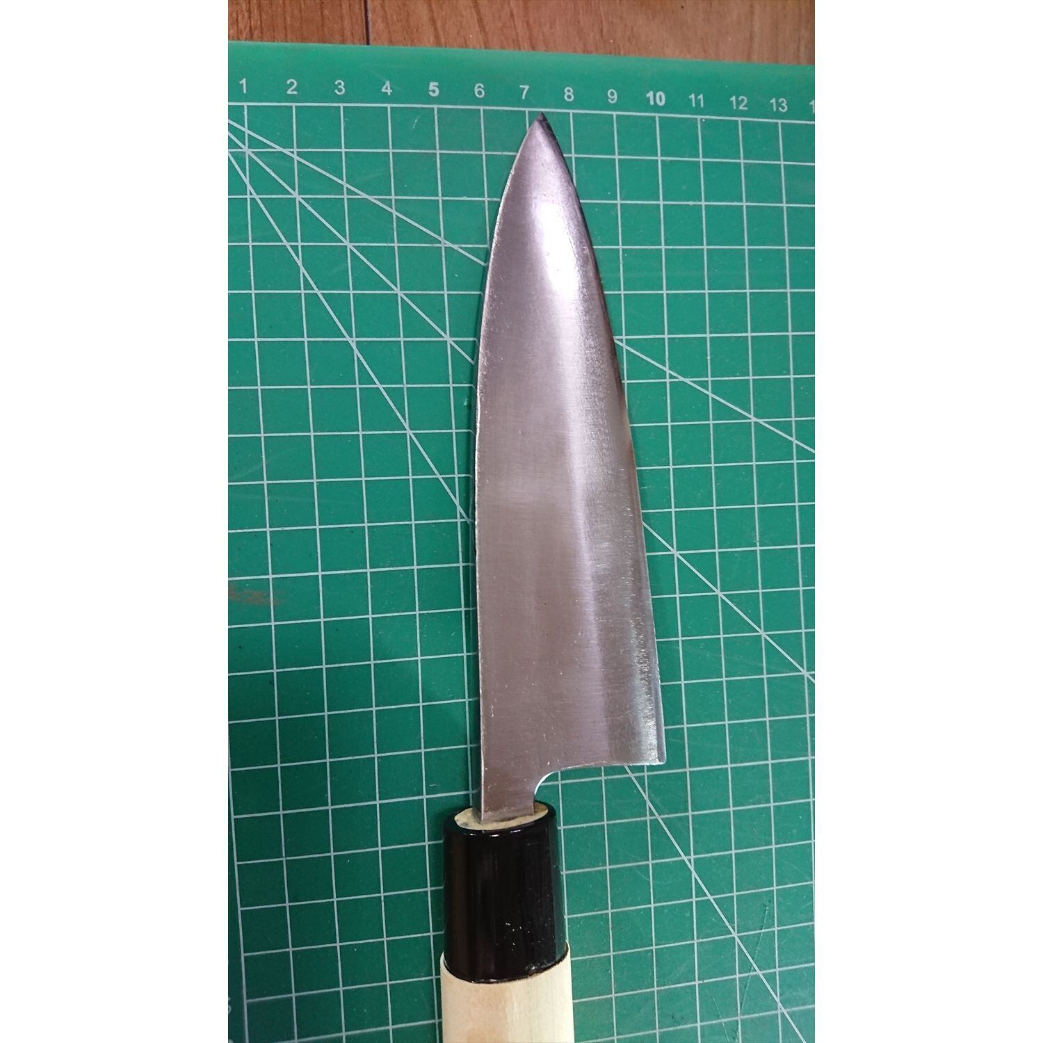 1. o1138/銘:銘?/出刃包丁(片刃)/刃長:145/峰厚 アゴ上:7.5/重量:178/作り:鋼?/他:柄は当社にて新品と交換済み