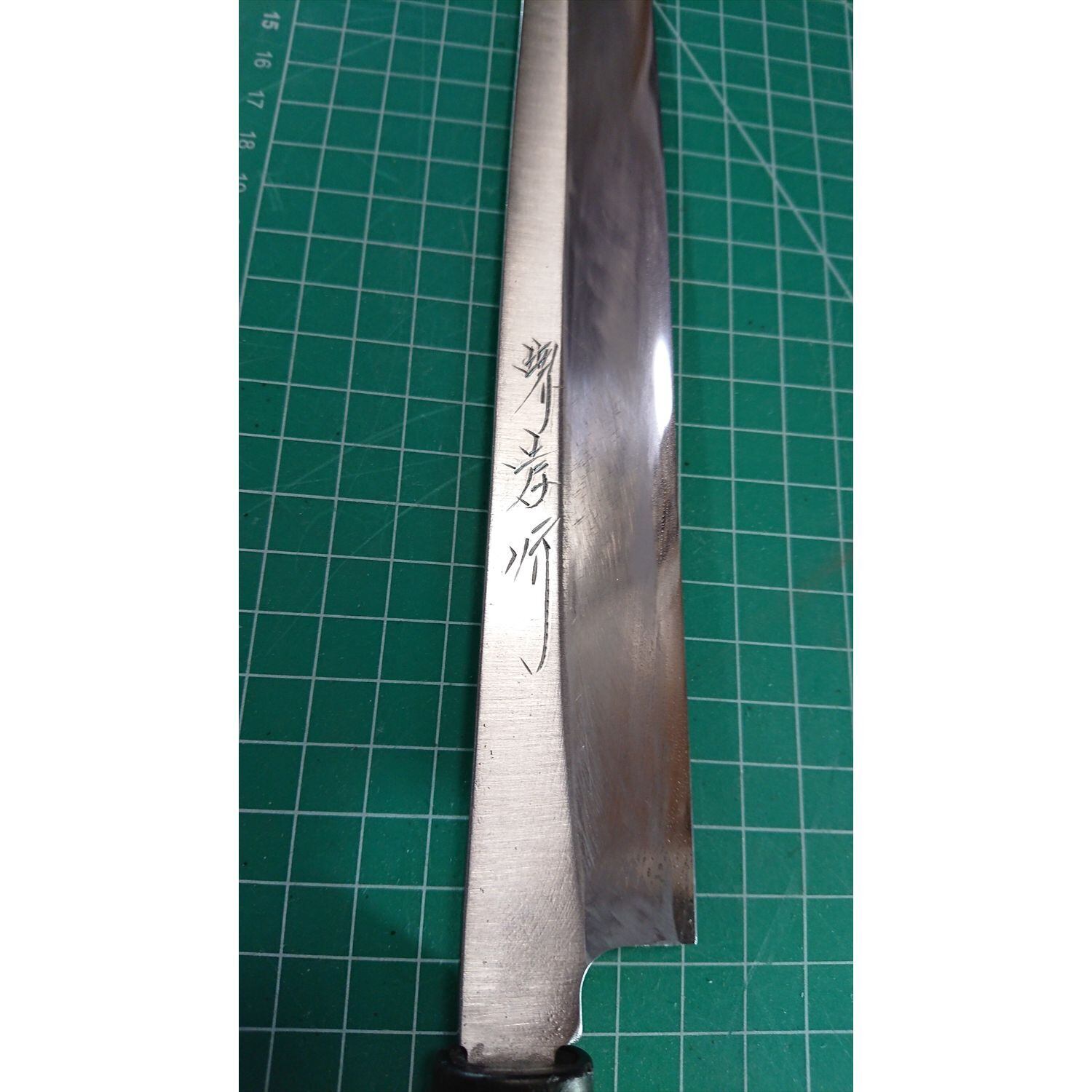 1. o1210/銘:堺孝行/刺身包丁(片刃)/刃長:315/峰厚 アゴ上:4.9/重量:243/作り:別打(白鋼?)/他: