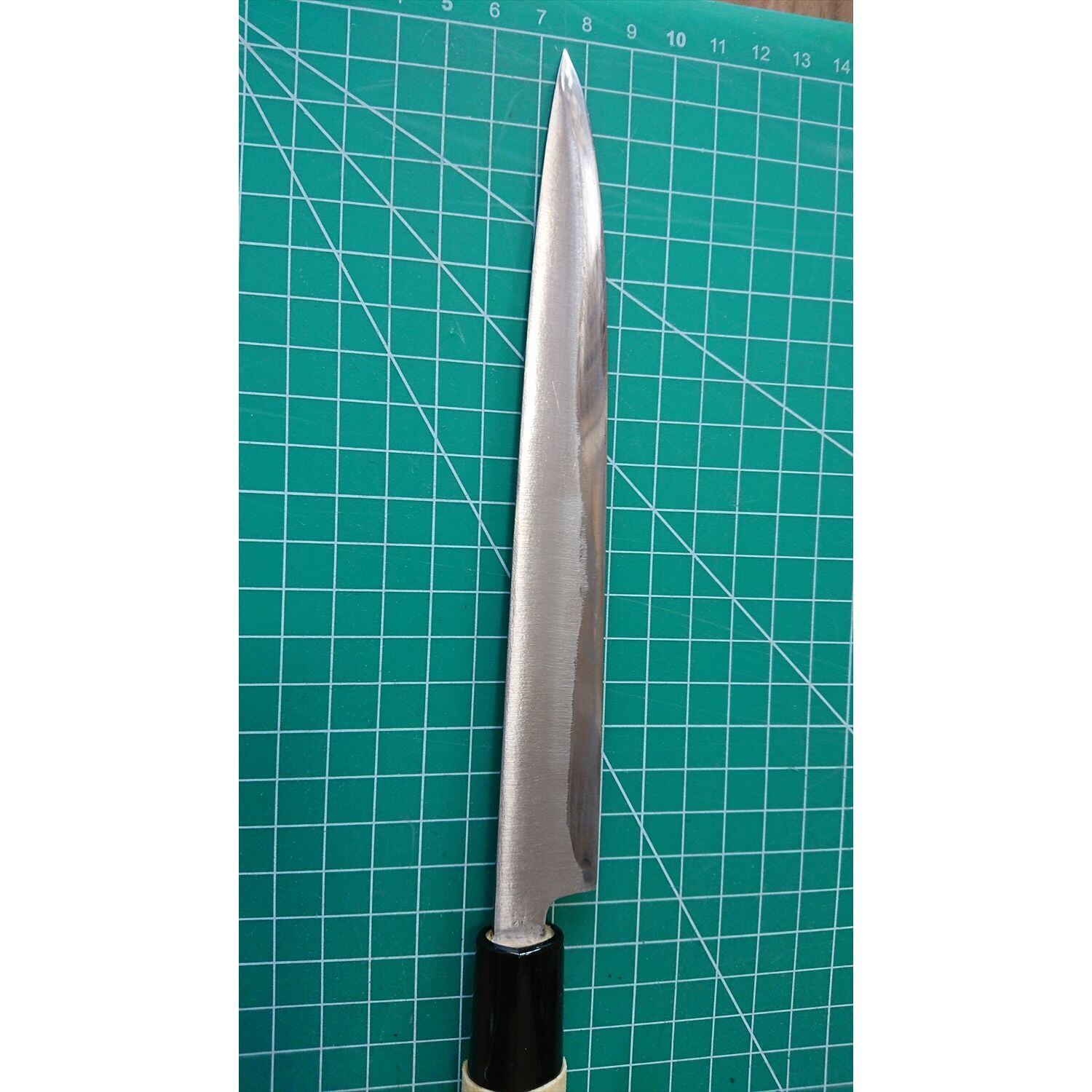 1. o1144/銘:堺末広/刺身包丁(両刃 約 左1:右9)/刃長:180/峰厚 アゴ上:3.1/重量:77/作り:鋼?/他:柄は当社にて新品と交換済み。銘は交換前の柄に記載がありました。