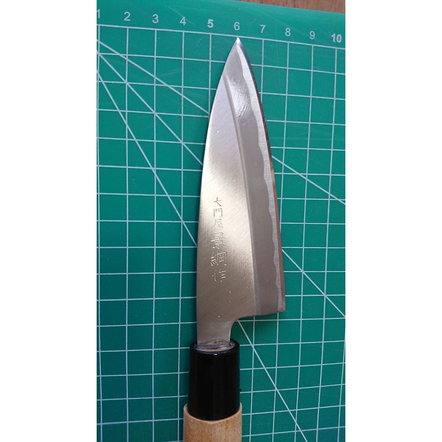 1. o1306/銘:大問屋 景綱作/あじ切り包丁(片刃)/刃長:105/峰厚 アゴ上:2.8/重量:73/作り:鋼?/他: