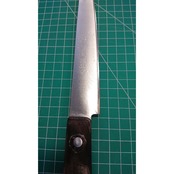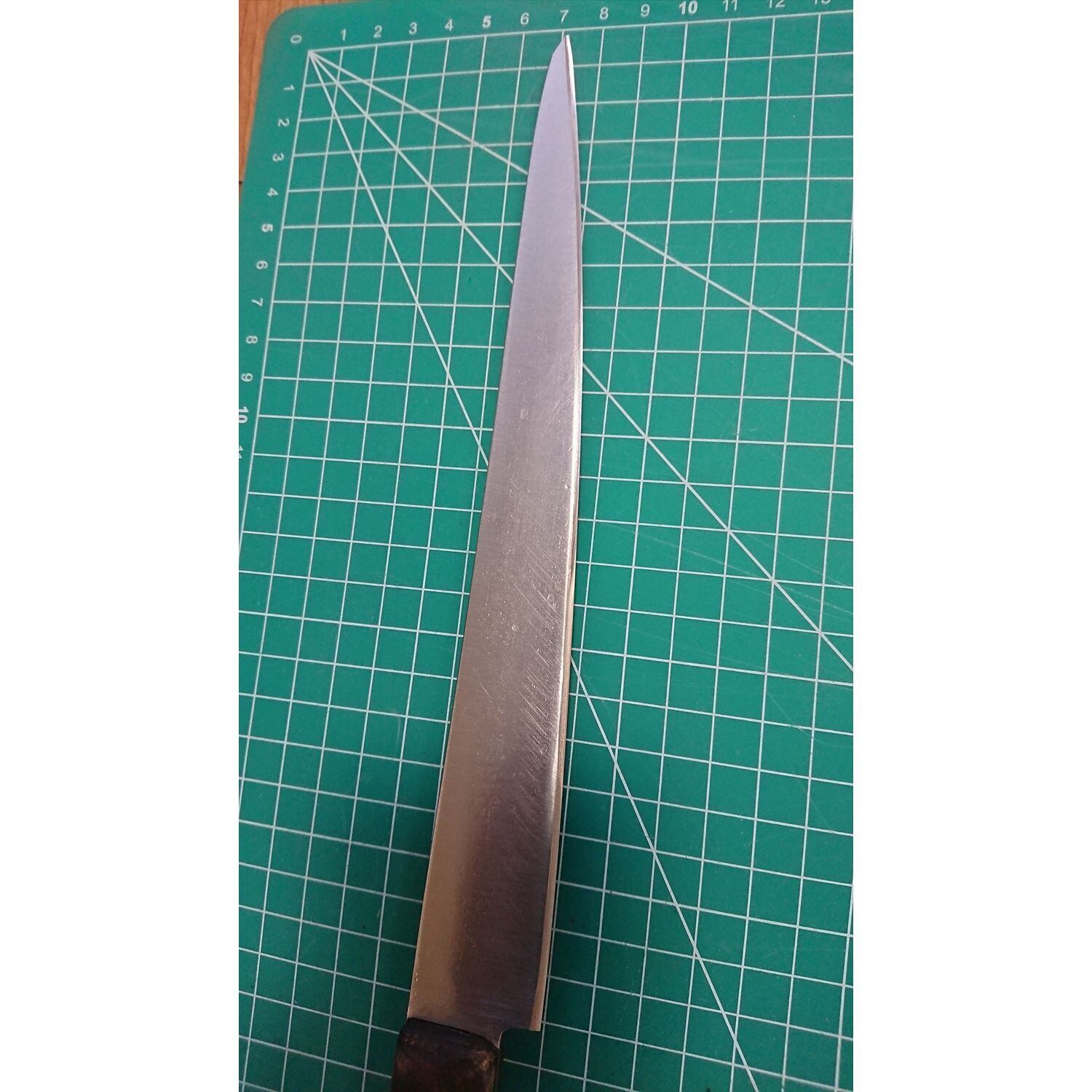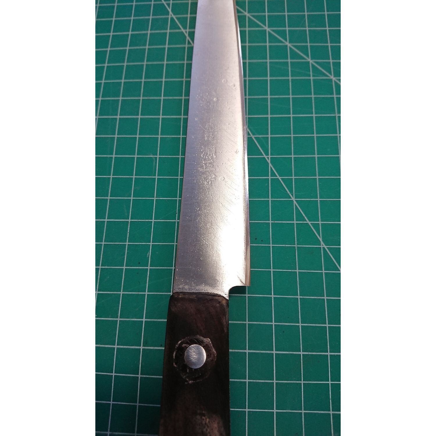 1. o1326/銘:源正守/筋引包丁(両刃 約 左1:右9)/刃長:230/峰厚 アゴ上:2.1/重量:148/作り:鋼?/他:柄に一部欠け、柄とリベットに少々段差があったが当社にて補修済み