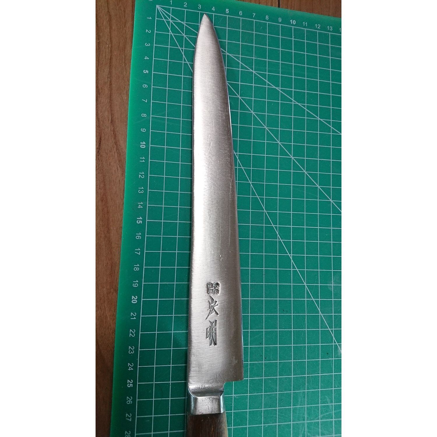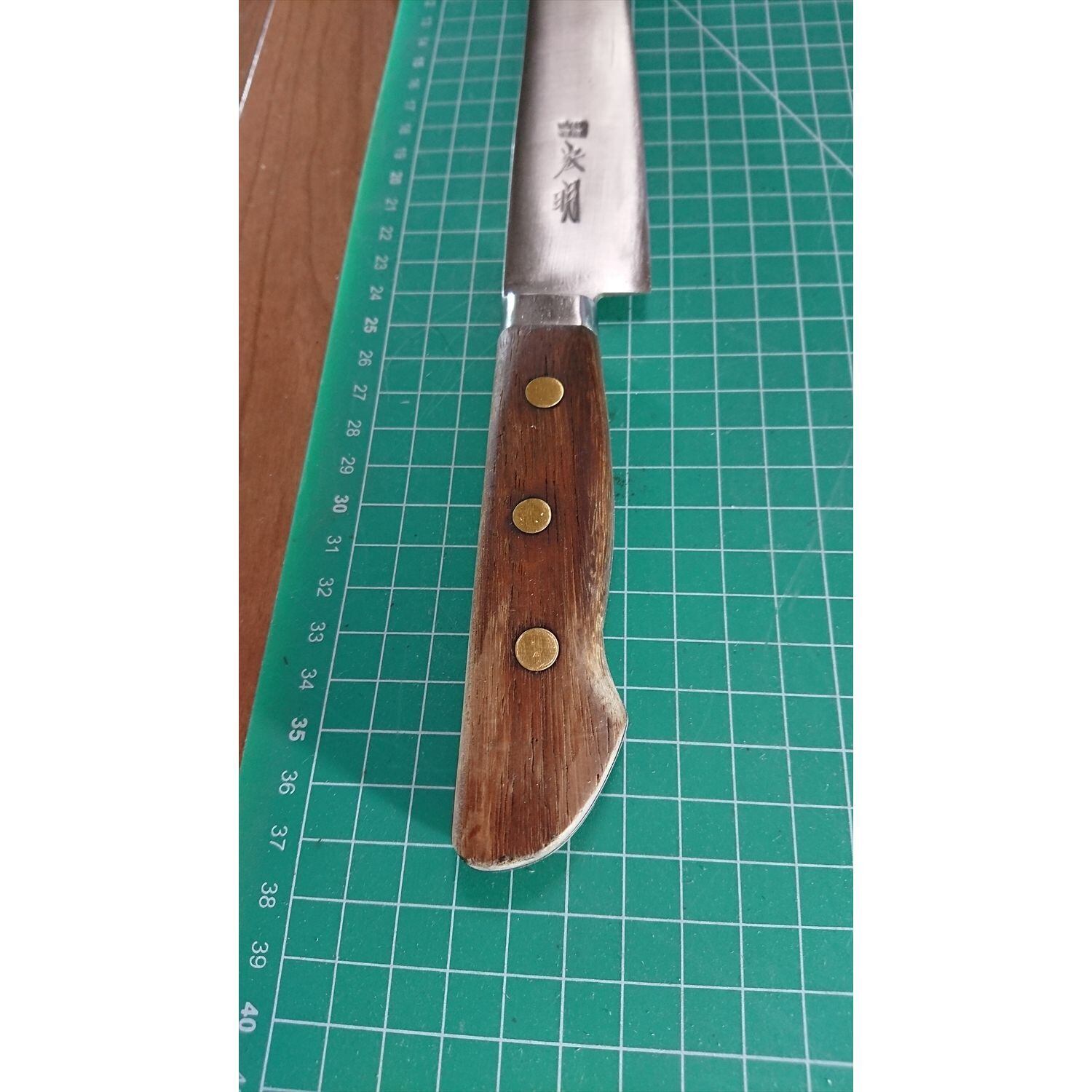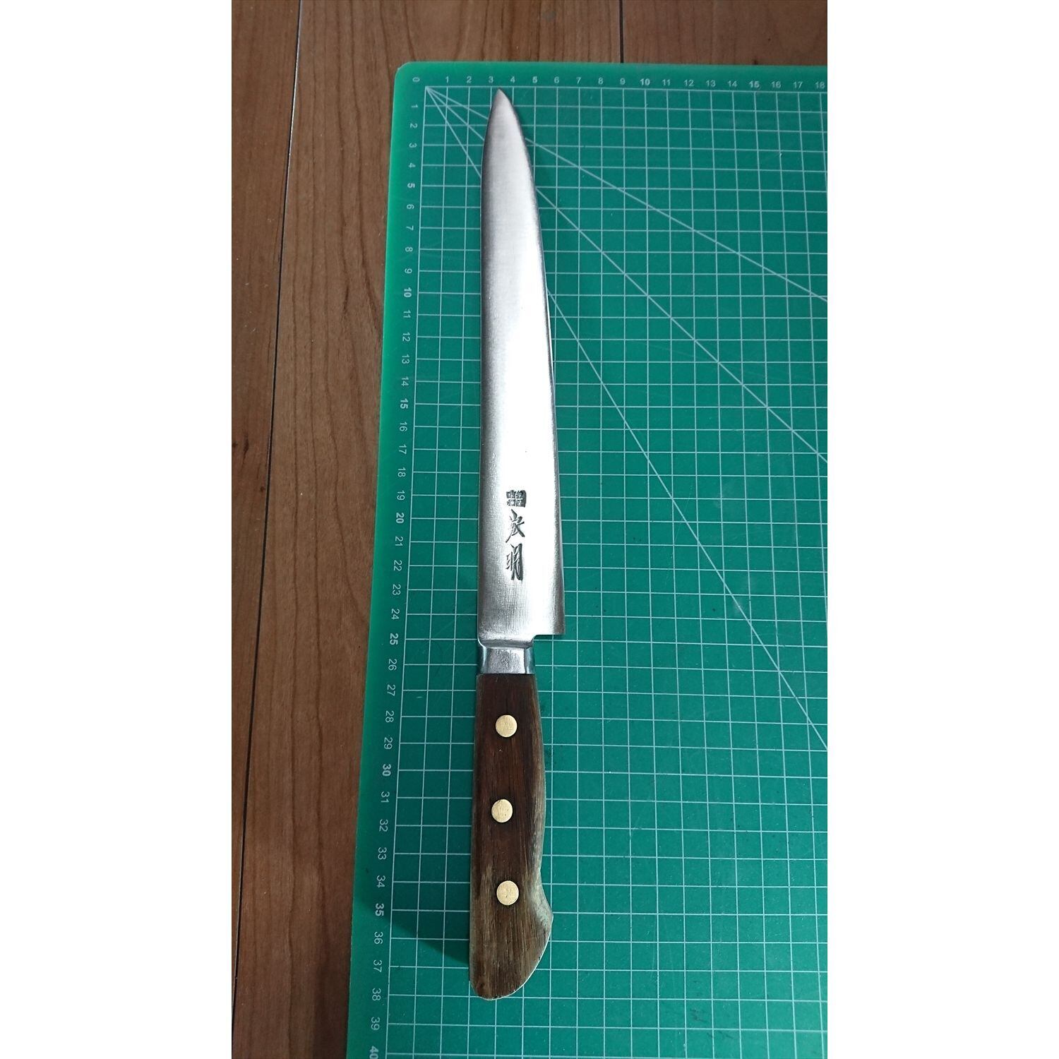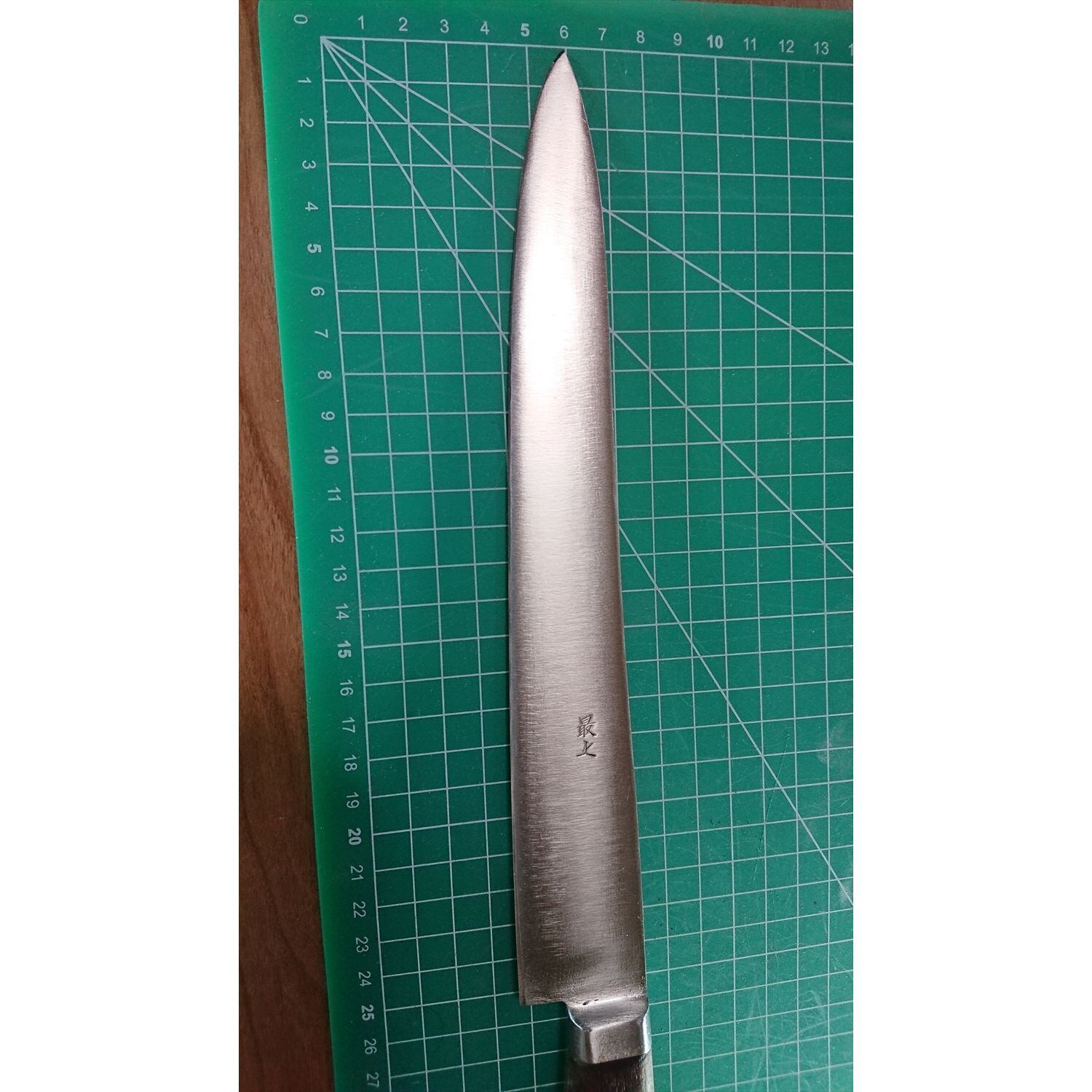 1. o1084/銘:宏明/筋引包丁(両刃)/刃長:250/峰厚 アゴ上:2.2/重量:200/作り:鋼? 最上/他: