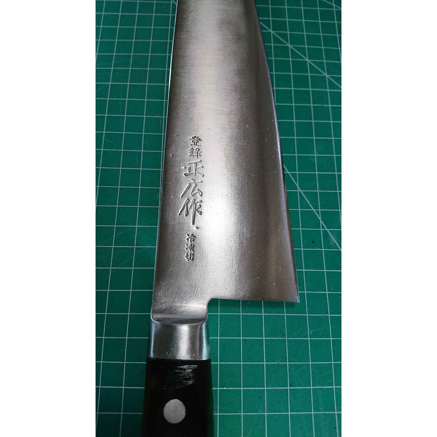 1. o1334/銘:正広作/冷凍切包丁(両刃)/刃長:265/峰厚 アゴ上:2.6/重量:395/作り:鋼?/他:柄と中子の間に少々スキマがあったので当社にて補修済み