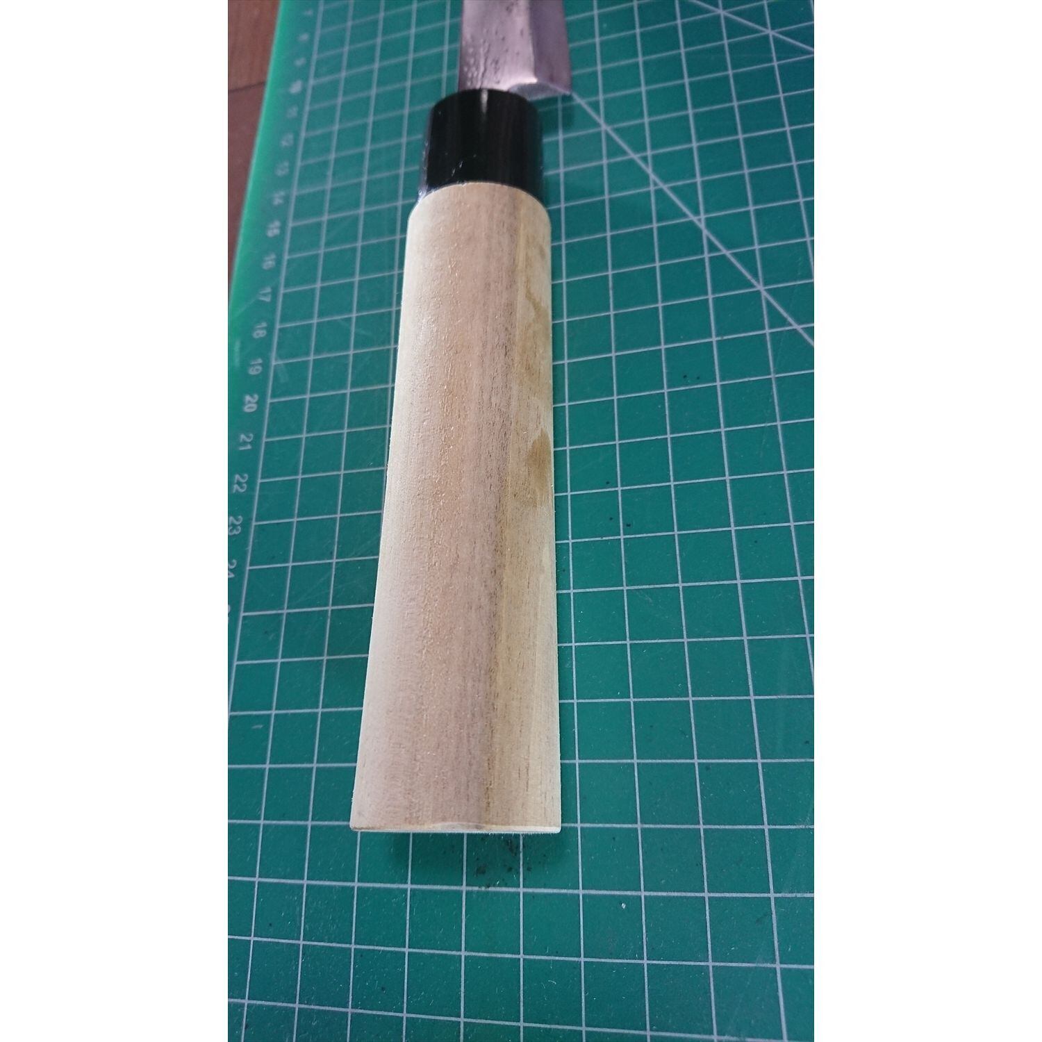 1. o1322/銘:?光作/特殊包丁(両刃 約 左1:右9)/刃長135:/峰厚 アゴ上:5.7/重量:179/作り:鋼?/他:柄は当社にて新品と交換済み