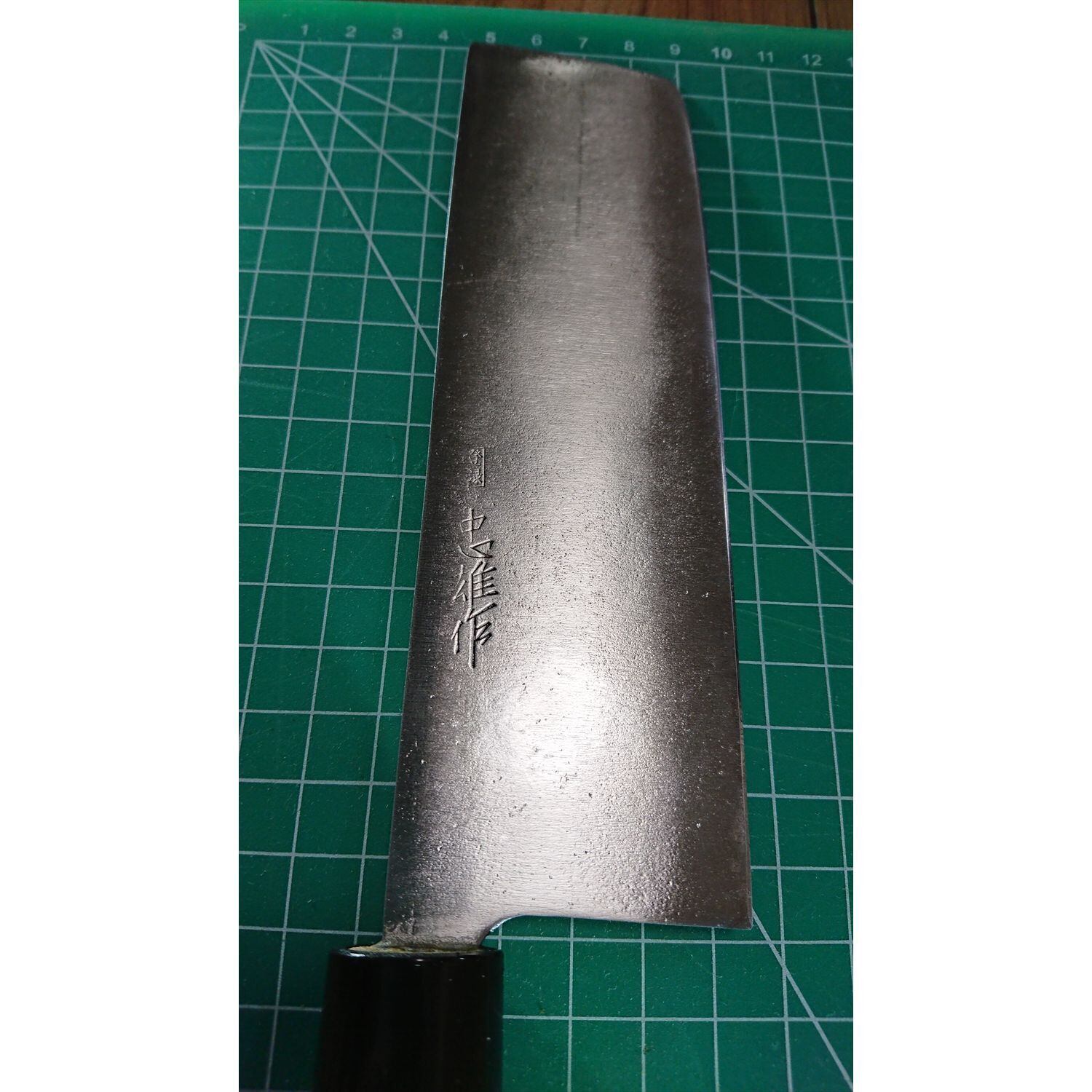 1. o1316/銘:忠雄作/菜切包丁(両刃)/刃長:165/峰厚 アゴ上:2.1/重量:105/作り:鋼?/他:柄は当社にて新品と交換済み