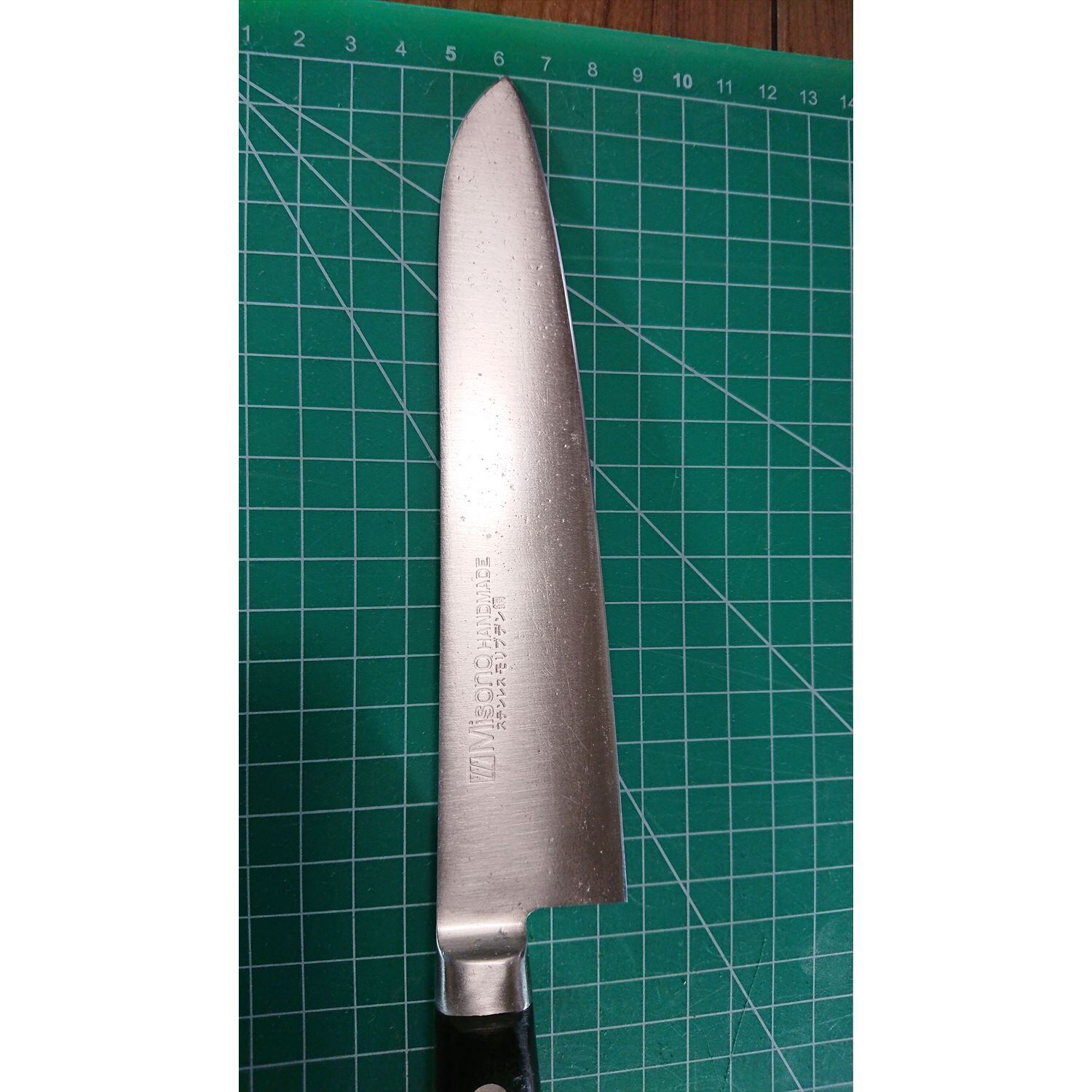 1. o1329/銘:Misono(ミソノ)/牛刀(両刃)/刃長:170/峰厚 アゴ上:2/重量:133/作り:HANDMADE ステンレスモリブデン鋼/他:ツバに名前が彫ってあったが当社にて除去済み