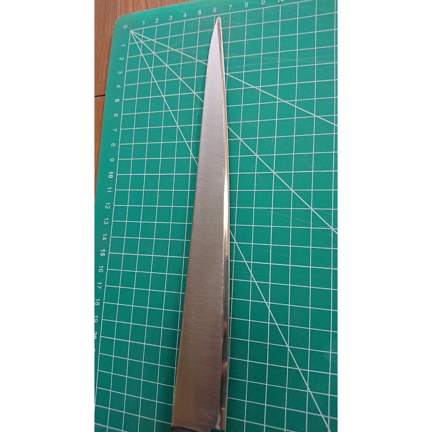 1. o1325/銘:源正守/筋引包丁(両刃 約 左1:右9)/刃長:230/峰厚 アゴ上:2.2/重量:145/作り:鋼? 肉専用/他:柄とリベットに少々段差があったが当社にて補修済み