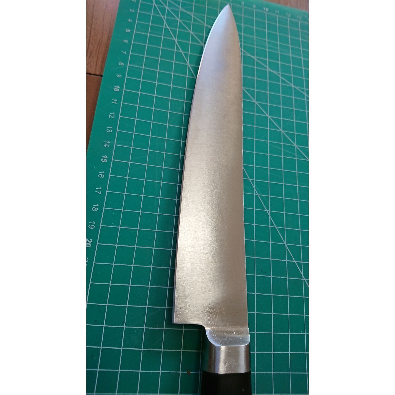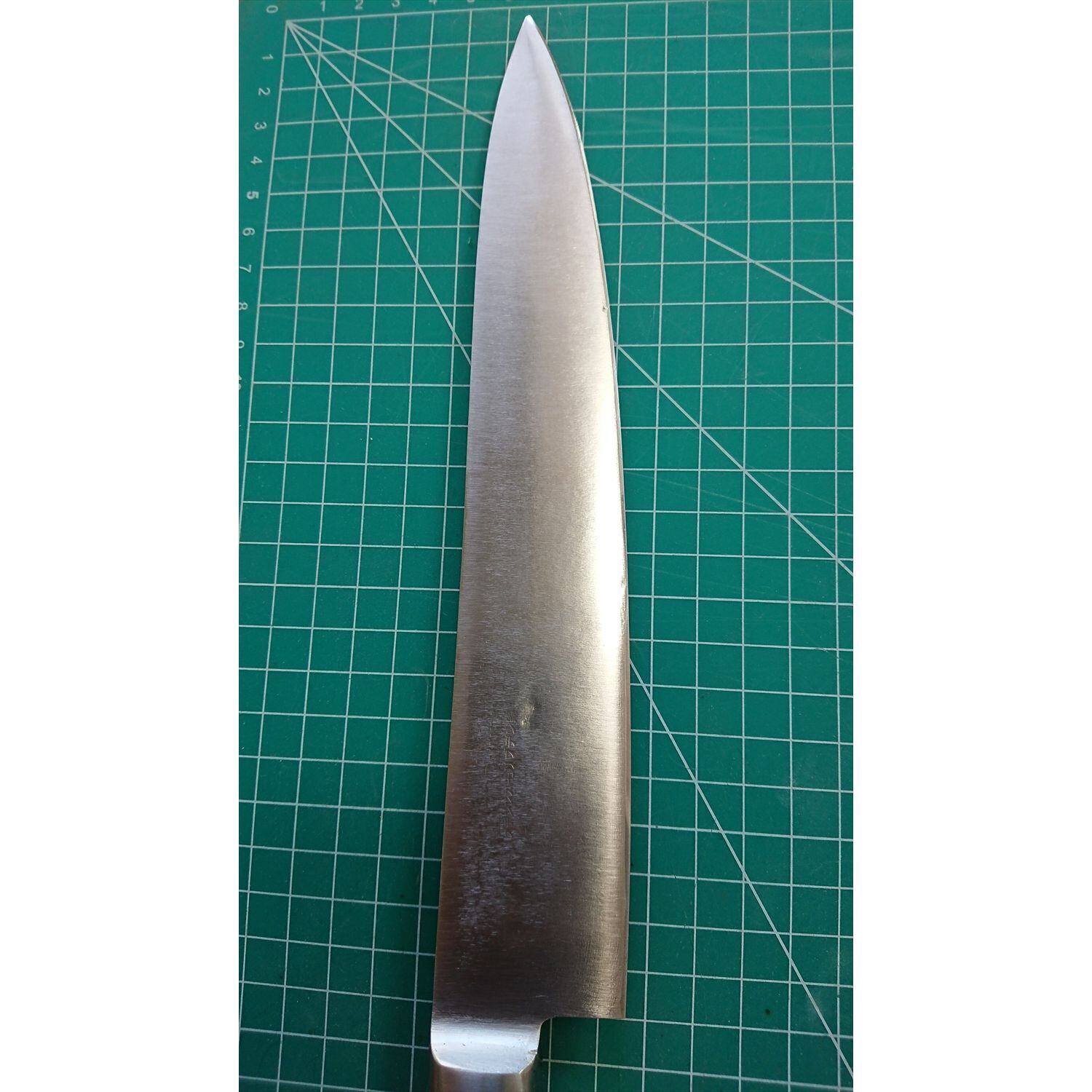 1. o1328/銘:Misono(ミソノ)/牛刀(両刃)/刃長:235/峰厚 アゴ上:2.2/重量:233/作り:HANDMADE ステンレスモリブデン鋼/他:ツバに名前が彫ってあったが当社にて除去済み