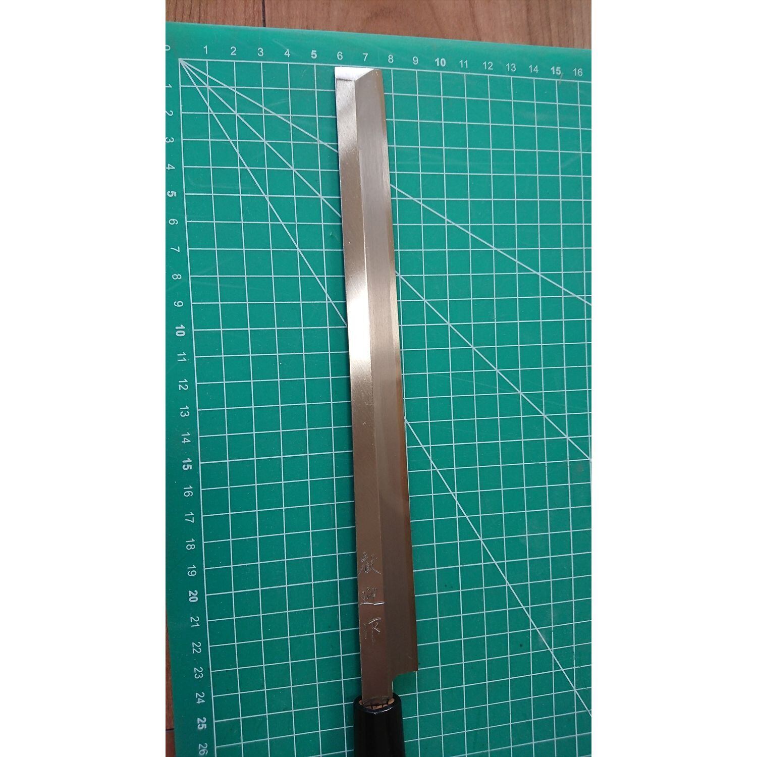 1. o1405/銘:歓迎作/蛸引包丁(片刃)/刃長:235/峰厚 アゴ上:2.9/重量:108/作り:特製正鋼/他:
