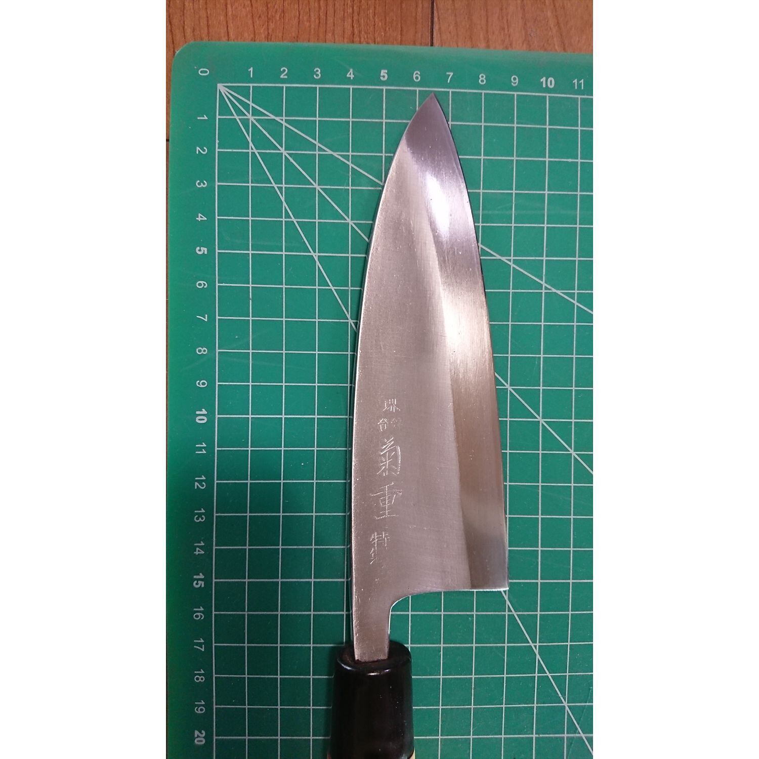 1. o1340/銘:堺 菊重/出刃包丁(片刃)/刃長:150/峰厚 アゴ上:7.9/重量:239/作り:鋼? 特製/他: