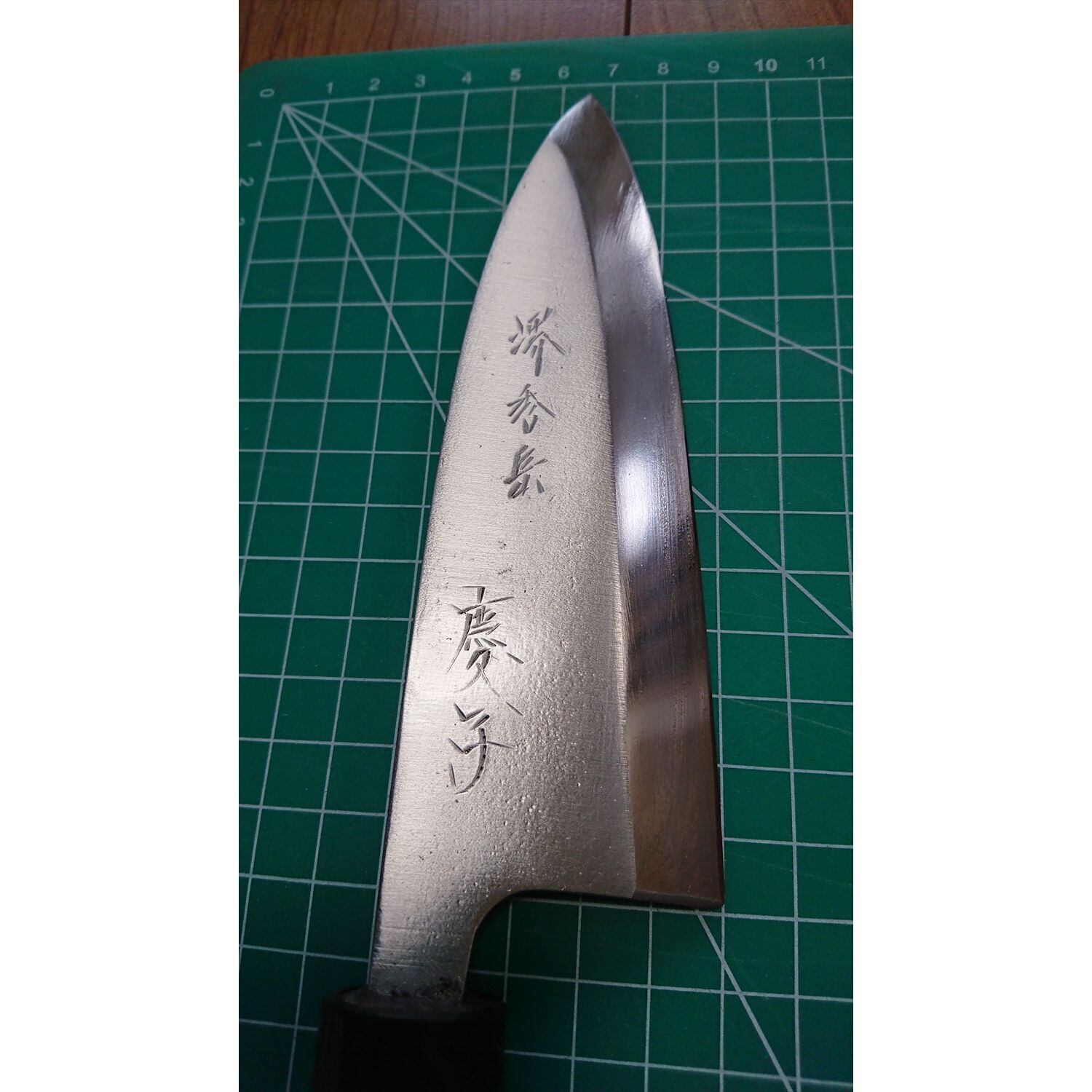1. o1373/銘:堺秀岳/出刃包丁(片刃)/刃長:150/峰厚 アゴ上:8.5/重量:250/作り:鋼?/他:「慶子」と彫り有り