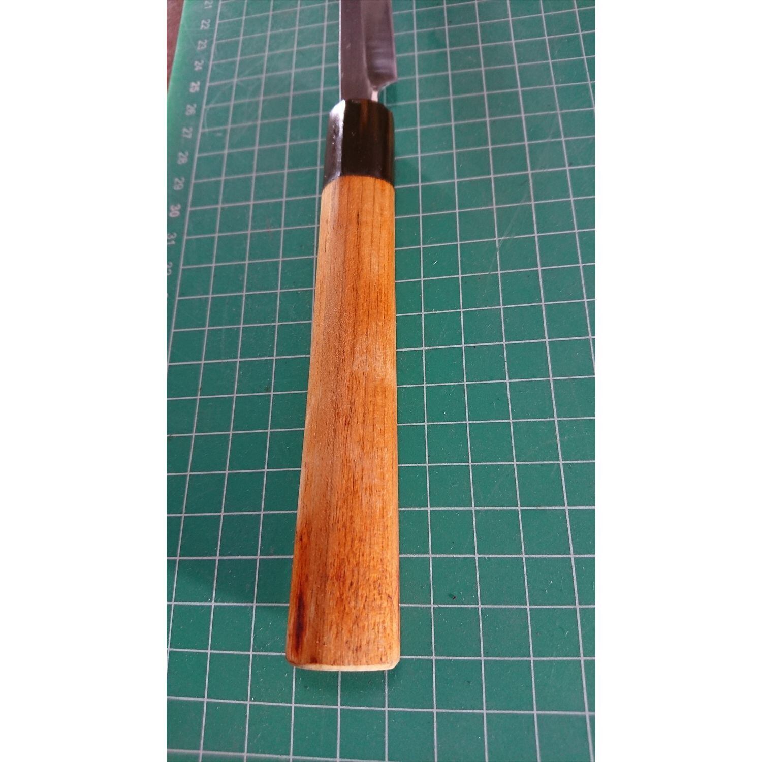 1. o1417/銘:銘?/蛸引包丁(両刃 約 左1:右9 右利き用)/刃長:265/峰厚 アゴ上:2.6/重量:75/作り:鋼?/他:口輪に虫食いと亀裂があったが当社にて補修済み