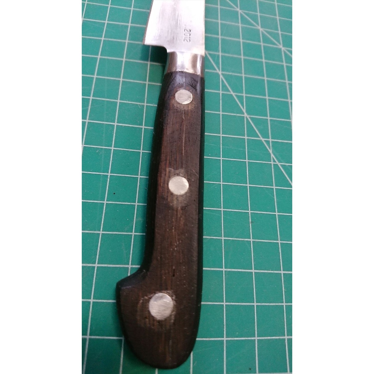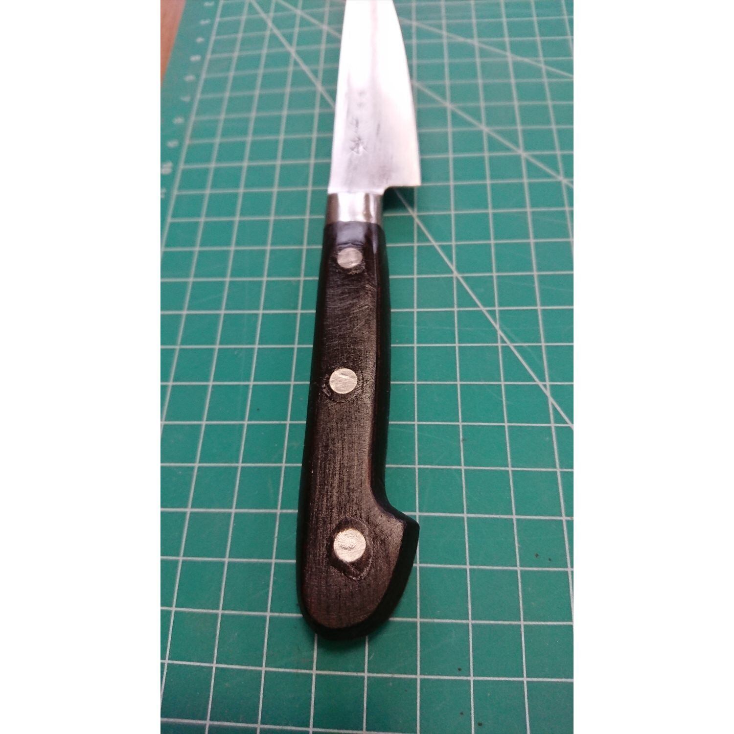 1. o1444/銘:東京杉本/ペティナイフ(両刃 右利き・左利き兼用)/刃長:110/峰厚 アゴ上:1.1/重量:62/作り:鋼?/他:柄の割れや剥がれ、リベット外れ等あったが当社にて補修済み