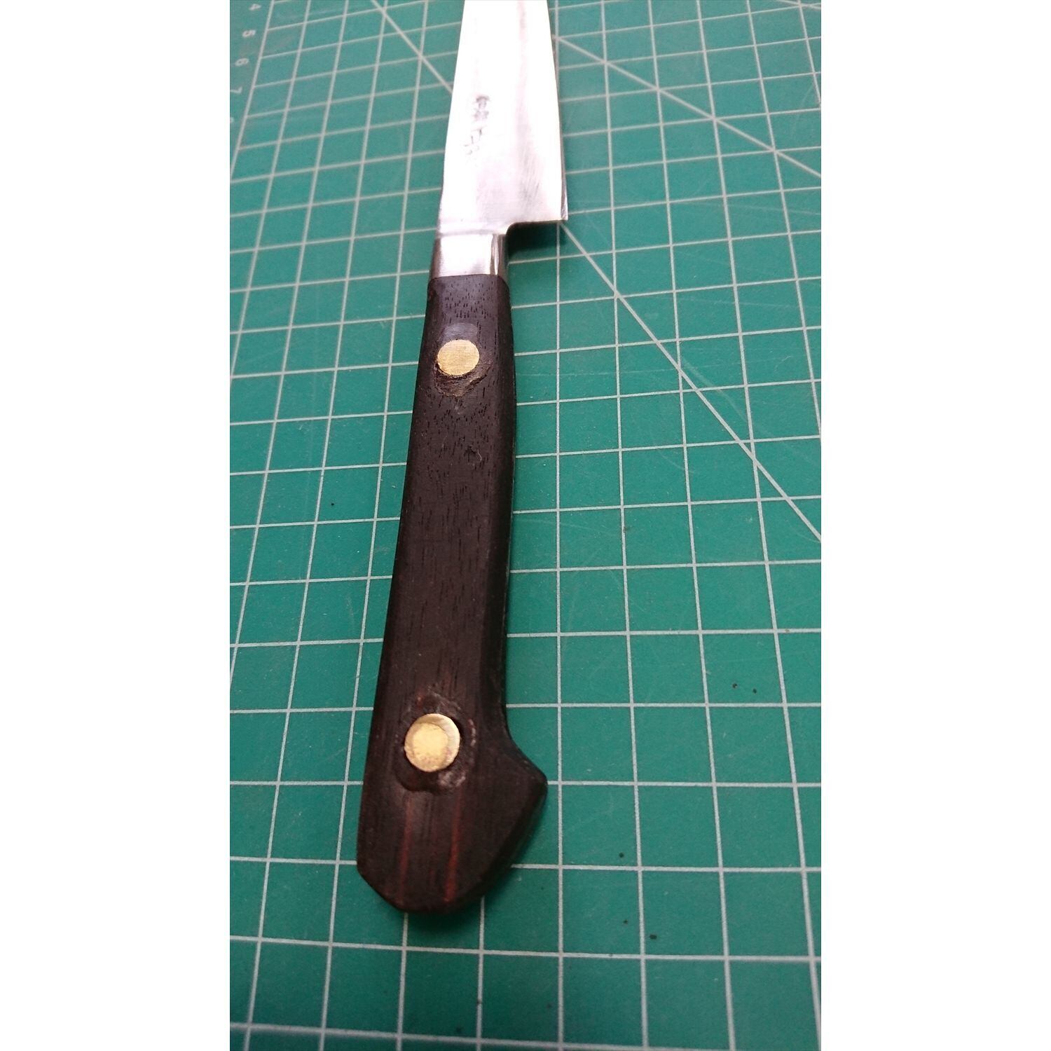 1. o1445/銘:正本/ペティナイフ(両刃 右利き・左利き兼用)/刃長:120/峰厚 アゴ上:1.5/重量:58/作り:鋼? 誂/他:柄の割れや剥がれ、リベット外れ等あったが当社にて補修済み