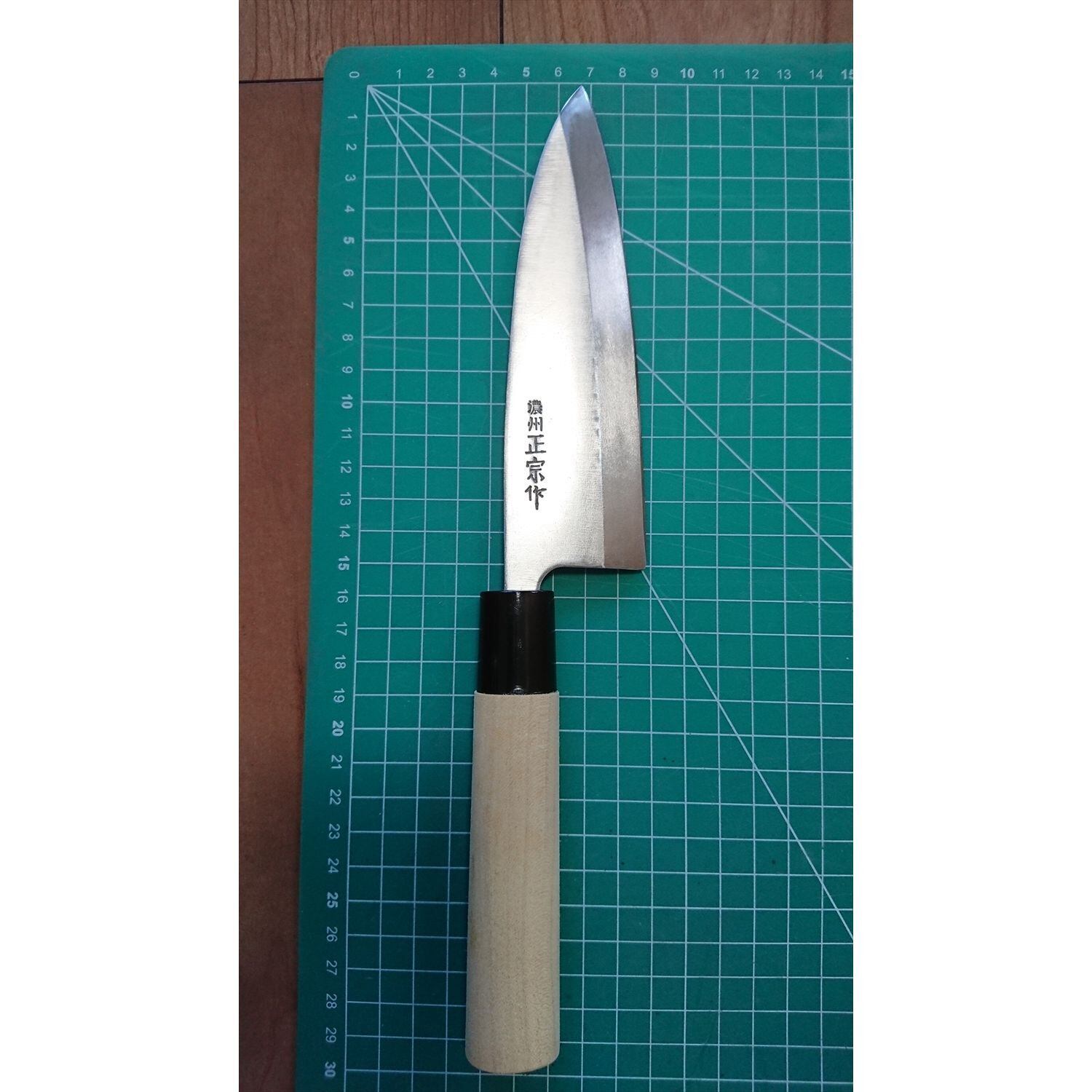 1. o1483/銘:濃州正宗/相出刃包丁(片刃 右利き用)/刃長:150/峰厚 アゴ上:2.8/重量:132/作り:鋼?/他:柄は当社にて新品と交換済み
