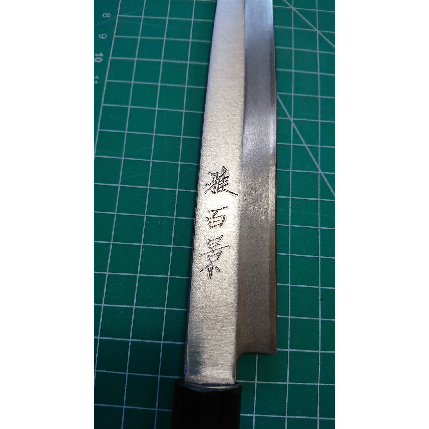1. o1492/銘:雅百景/刺身包丁(片刃 右利き用)/刃長:200/峰厚 アゴ上:3.7/重量:125/作り:鋼?/他: