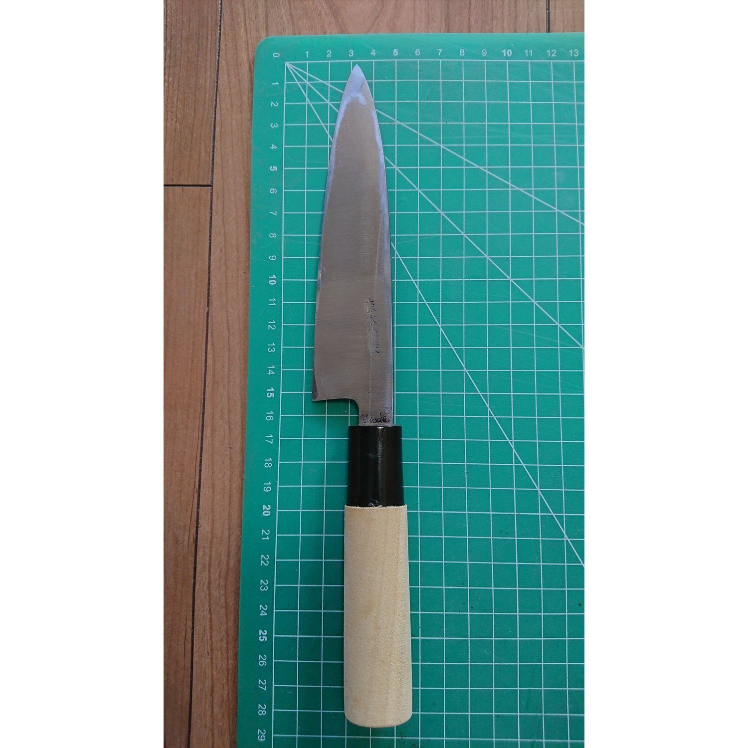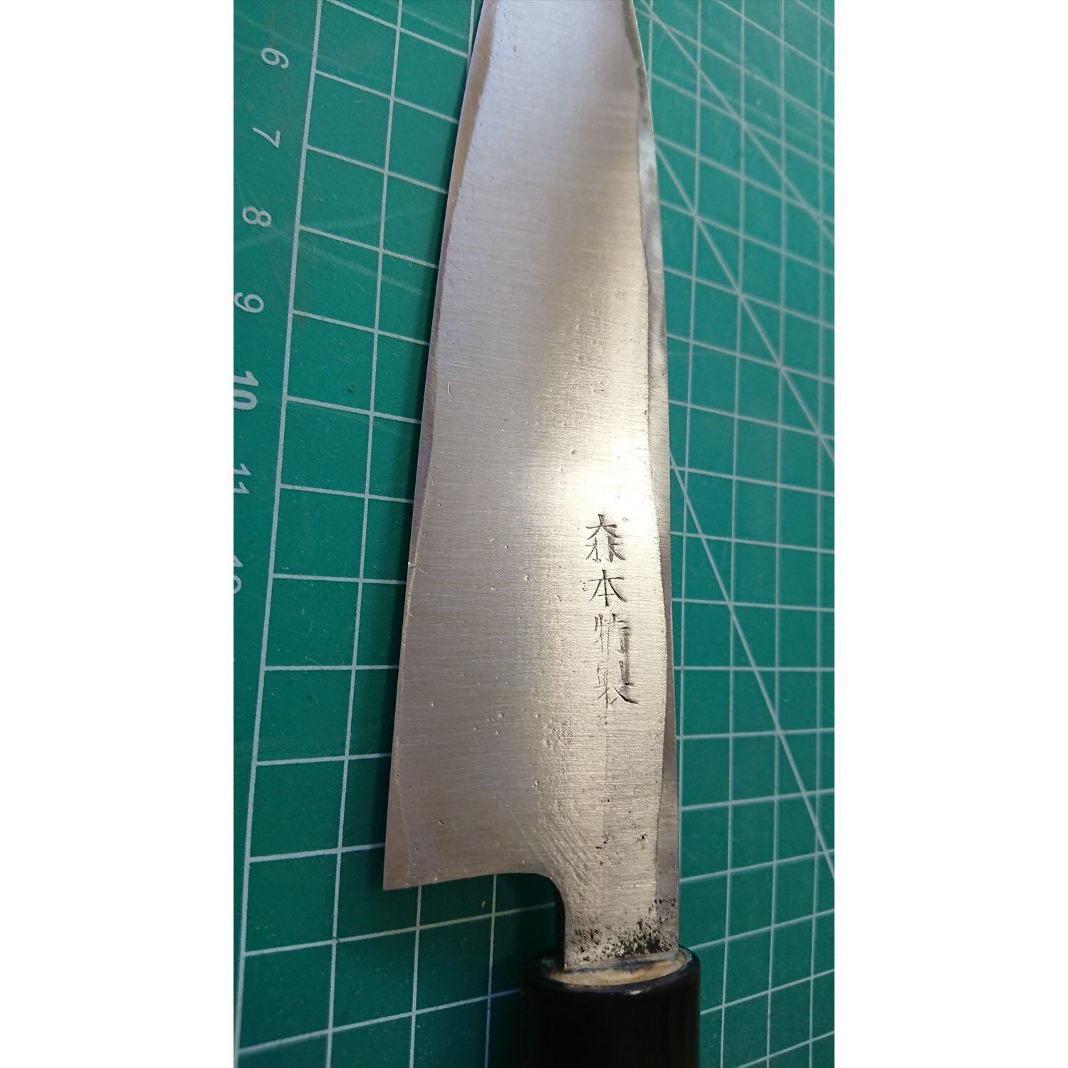 1. o1485/銘:森本/身卸出刃包丁(片刃 右利き用)/刃長:150/峰厚 アゴ上:3.9/重量:120/作り:鋼? 特製/他:柄は当社にて新品と交換済み