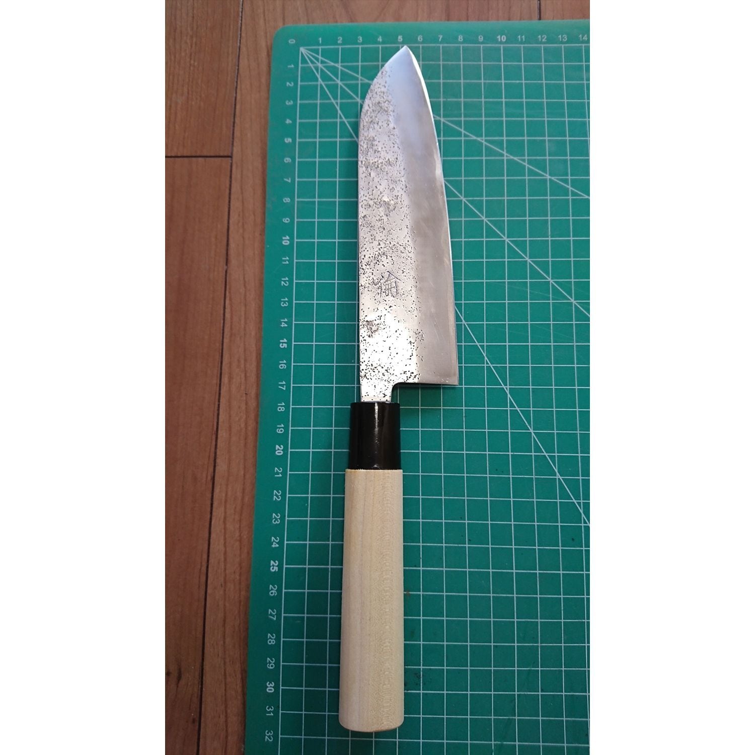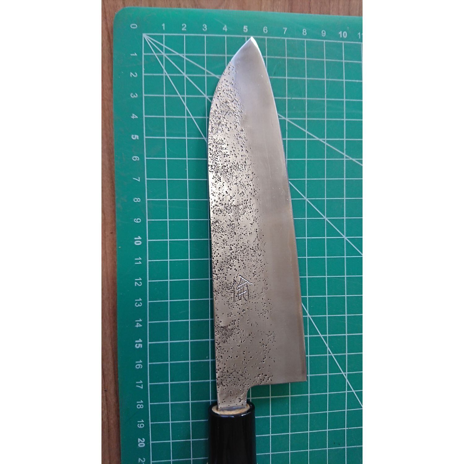 1. o1500/銘:倫/三徳包丁(両刃 右利き・左利き兼用)/刃長:170/峰厚 アゴ上:2.3/重量:129/作り: 鋼? 梨地模様/他:柄は当社にて新品と交換済み