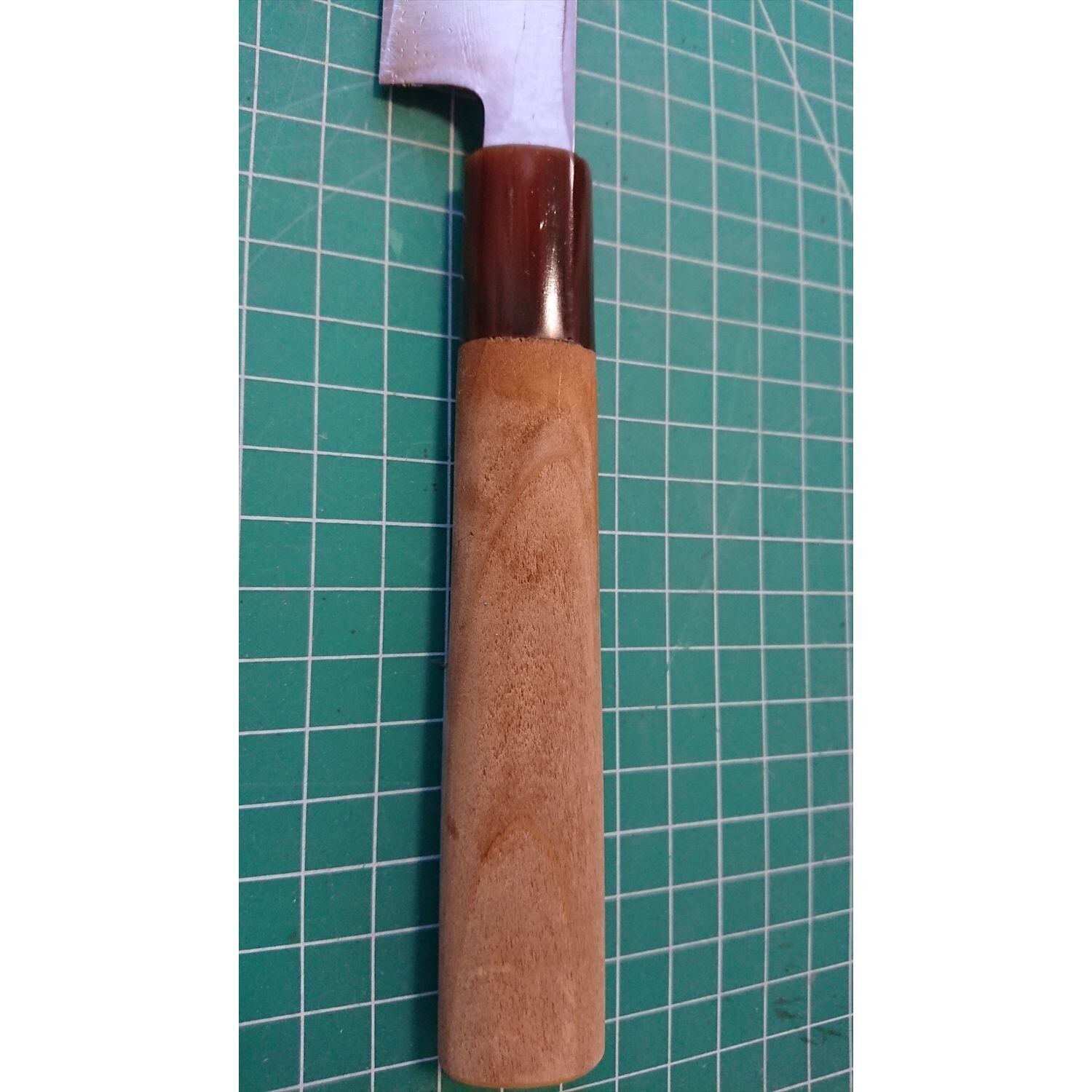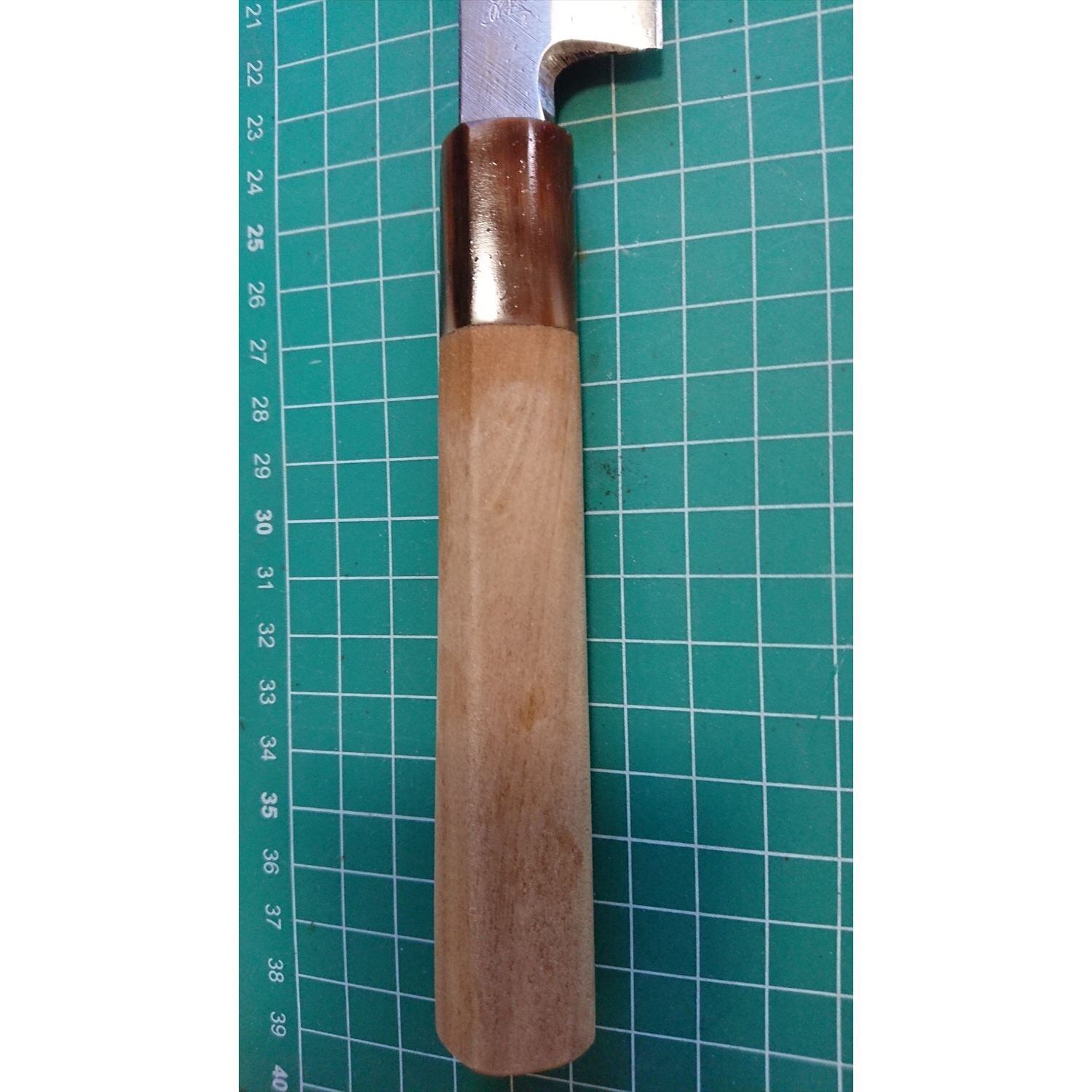 1. o1737/銘:堺刀司 岩国作/刺身包丁(片刃 右利き用)/刃長:230/峰厚 アゴ上:4.2/重量:147/作り:鋼?/他:口輪に一部虫食いがあったが当社にて補修済み