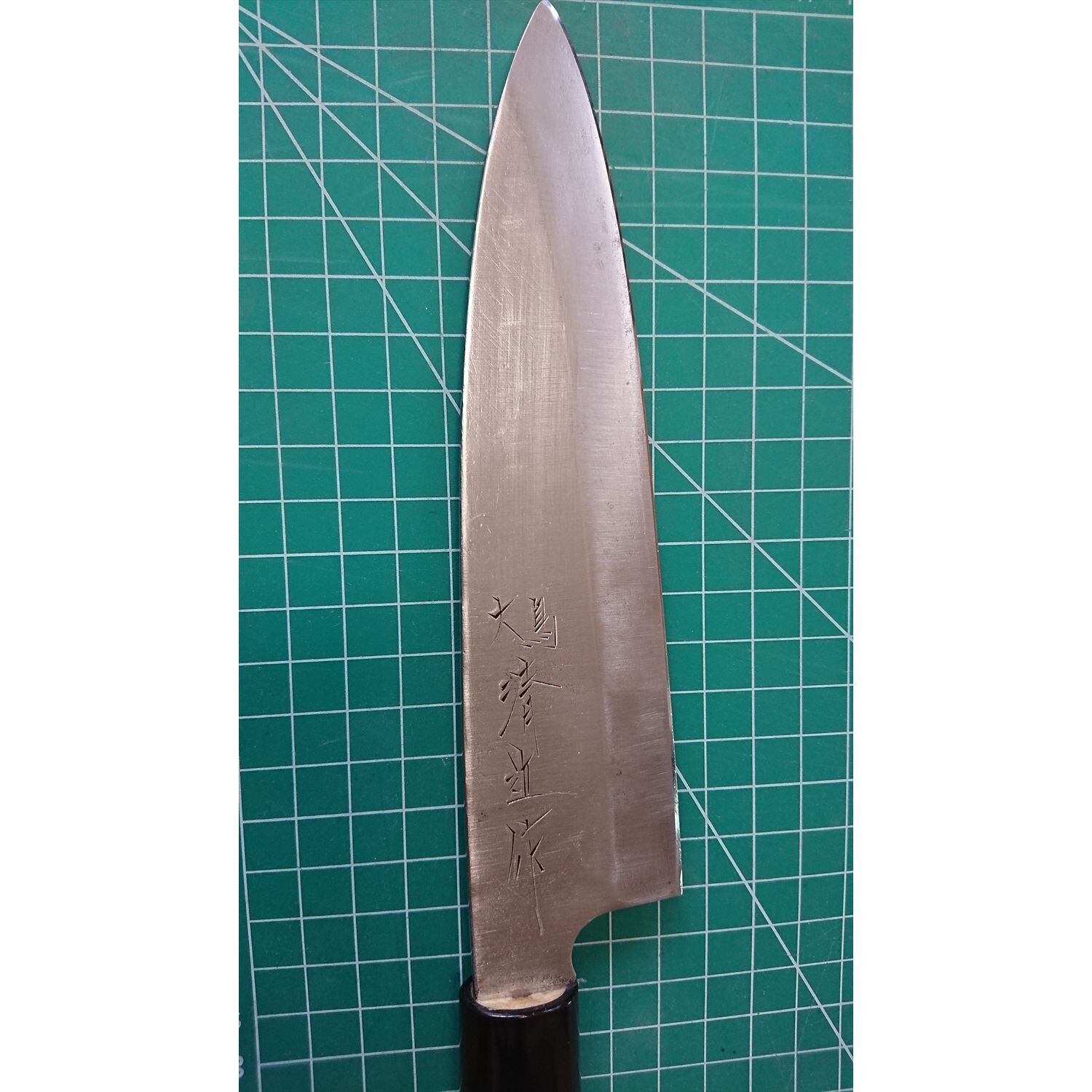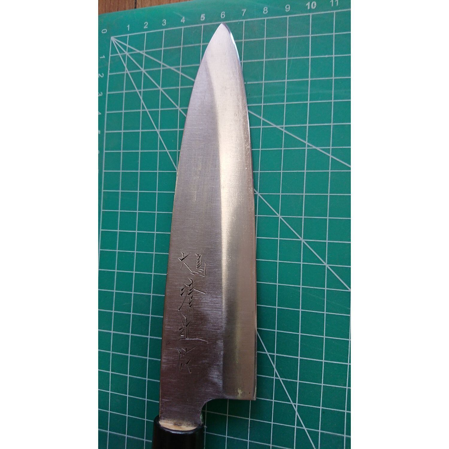 1. o1675/銘:大鳥清近作/身卸出刃包丁(両刃 約 左1:右9 右利き用)/刃長:170/峰厚 アゴ上:4.6/重量:156/作り:鋼?/他:柄は当社にて新品と交換済み