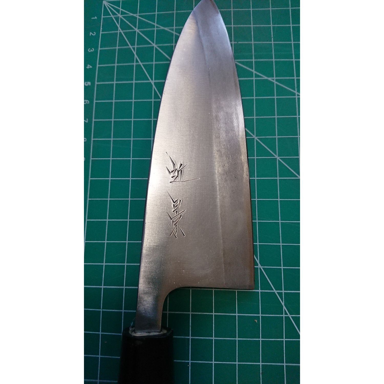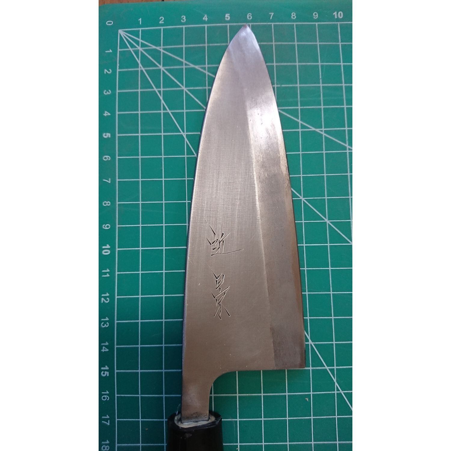 1. o1717/銘:近景/出刃包丁(片刃 右利き用)/刃長:150/峰厚 アゴ上:7.5/重量:225/作り:鋼?/他: