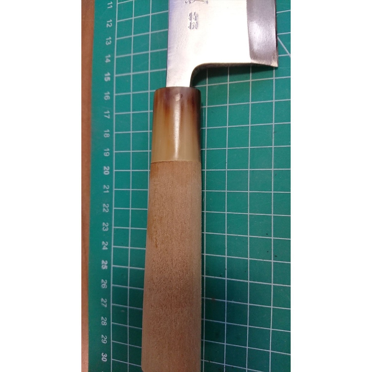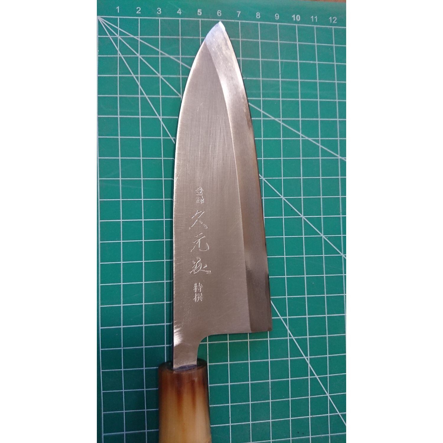 1. o1716/銘:久元/出刃包丁(片刃 右利き用)/刃長:150/峰厚 アゴ上:7.6/重量:252/作り:鋼? 特選/他:口輪に一部虫食いがあったが当社にて補修済み