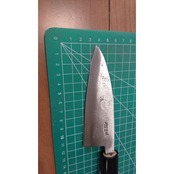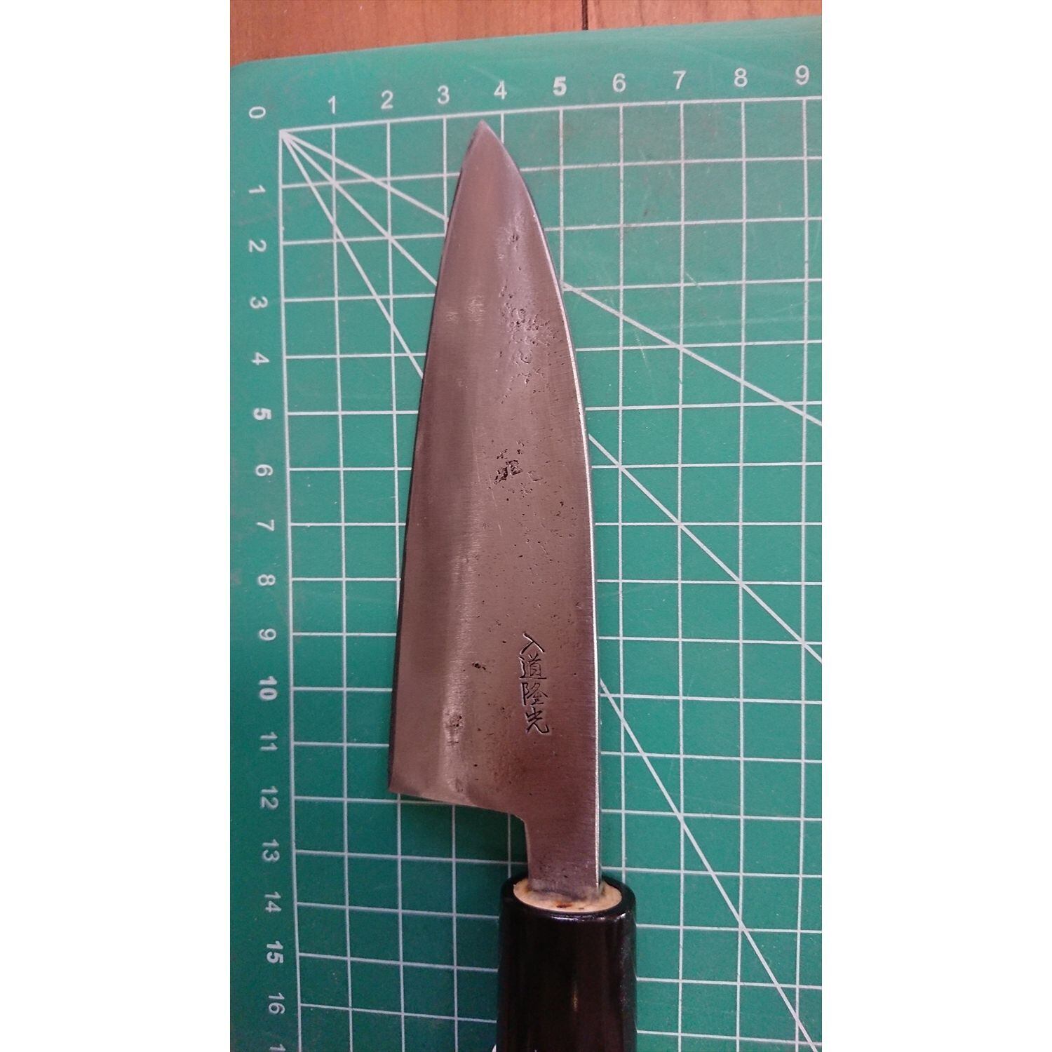 1. o1538/銘:入道隆光/あじ切り包丁(両刃 右利き・左利き兼用)/刃長:120/峰厚 アゴ上:3.5/重量:95/作り:鋼? 黒打ち/他:柄は当社にて新品と交換済み
