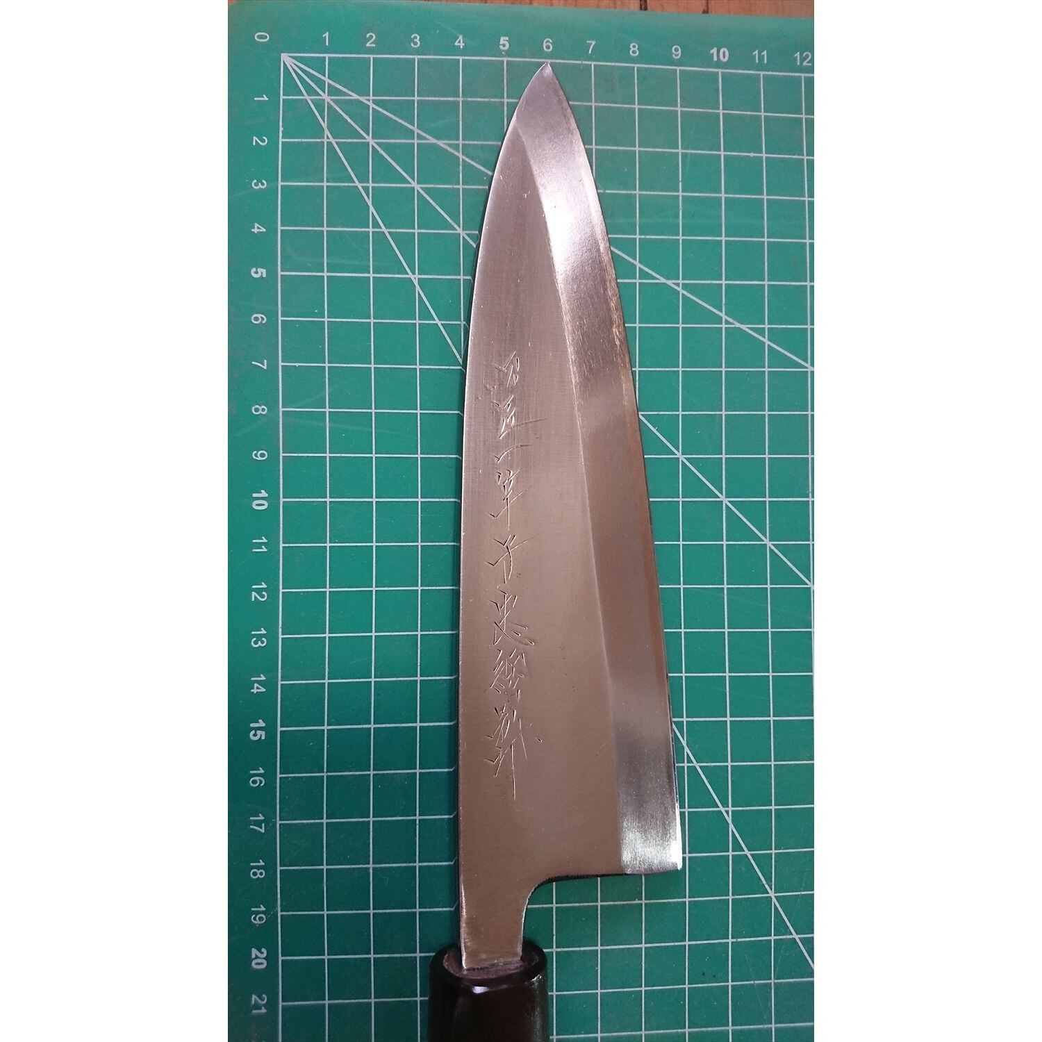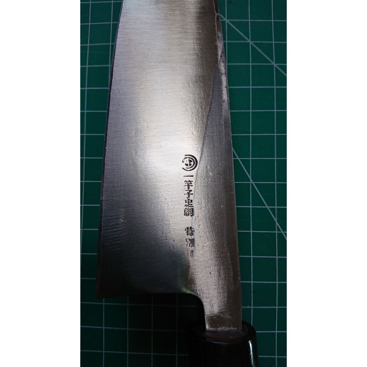 1. o1496/銘:一竿子忠綱/出刃包丁(片刃 右利き用)/刃長:180/峰厚 アゴ上:8.1/重量:330/作り:鋼? 特別打/他:柄に一部割れがあるが当社にて補修済み