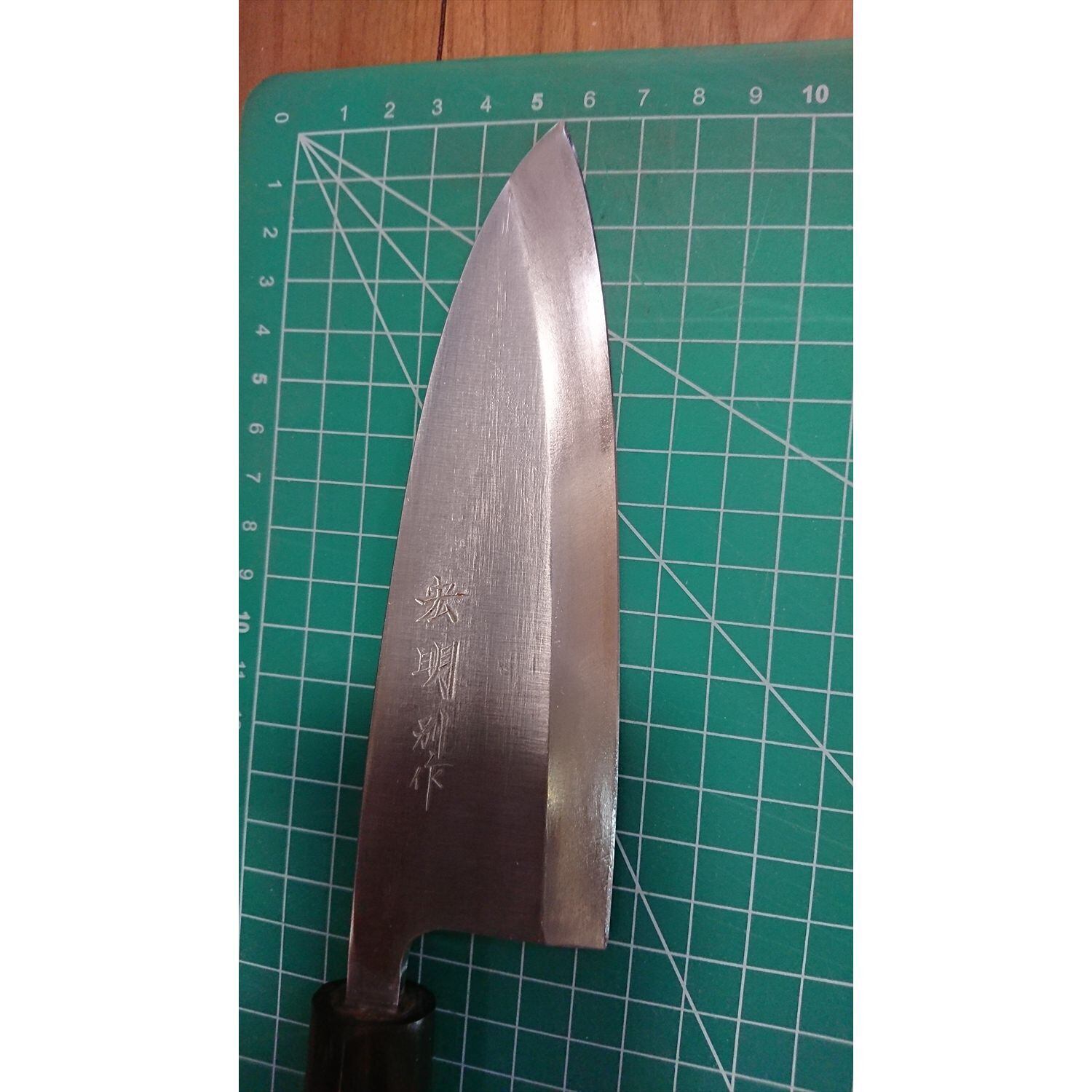 1. o1633/銘:宏明/出刃包丁(片刃 右利き用)/刃長:150/峰厚 アゴ上:7.5/重量:218/作り:鋼? 別作/他:汚い箱付き 柄に一部虫食いがあったが当社にて補修済み