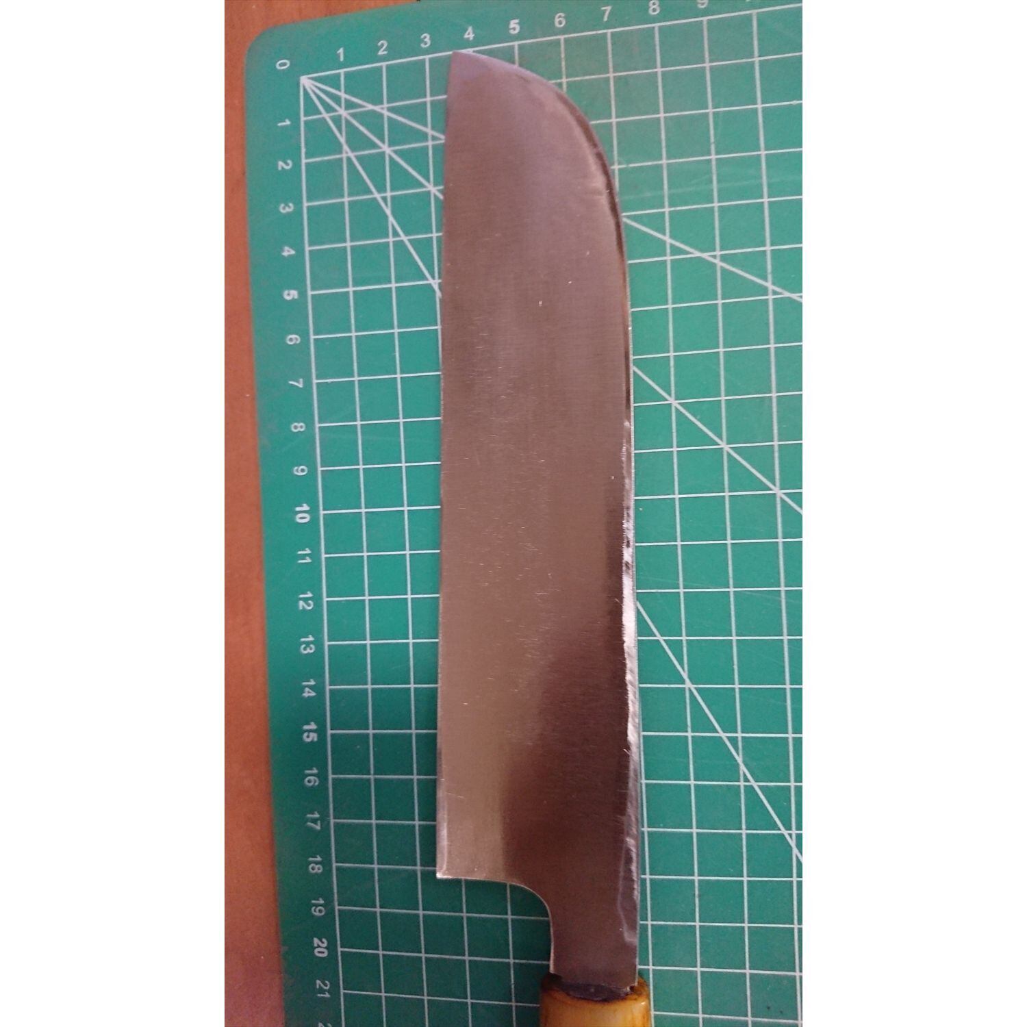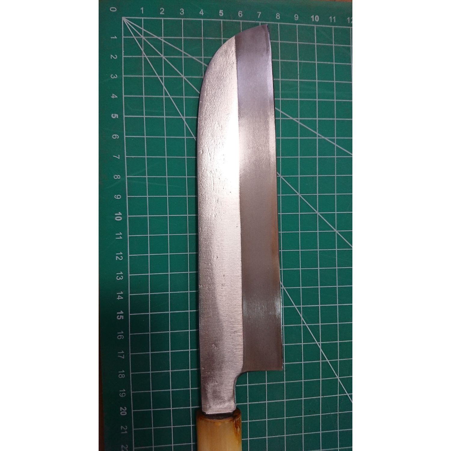 1. o1703/銘:銘?/鎌形薄刃包丁(片刃 右利き用)/刃長:185/峰厚 アゴ上:3.8/重量:186/作り:鋼?/他:柄に一部欠けがあったが当社にて補修済み