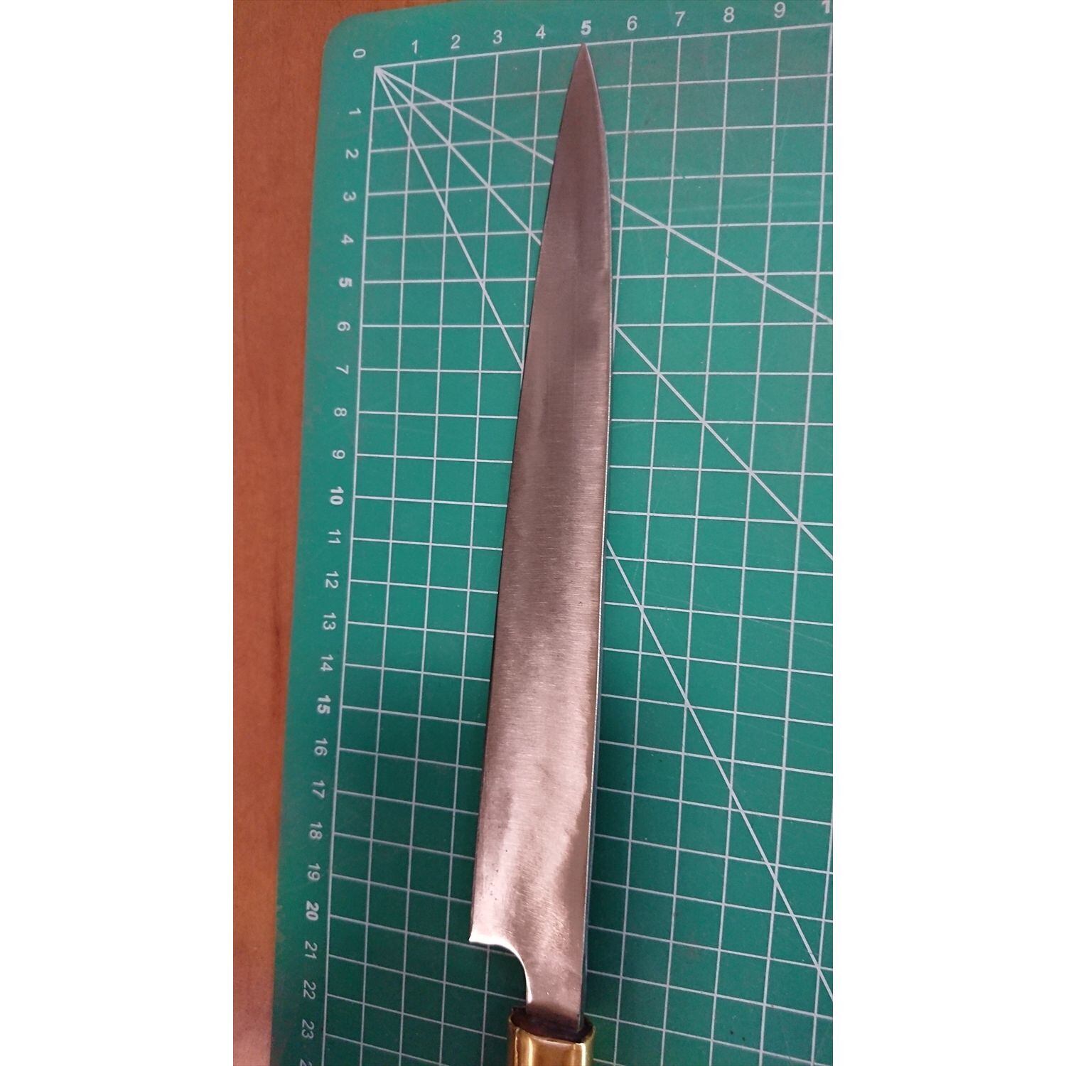 1. o1542/銘:堺重広/刺身包丁(両刃 約 左1:右9 右利き用)/刃長:200/峰厚 アゴ上:2.9/重量:96/作り:特製 別打(白鋼?)/他: