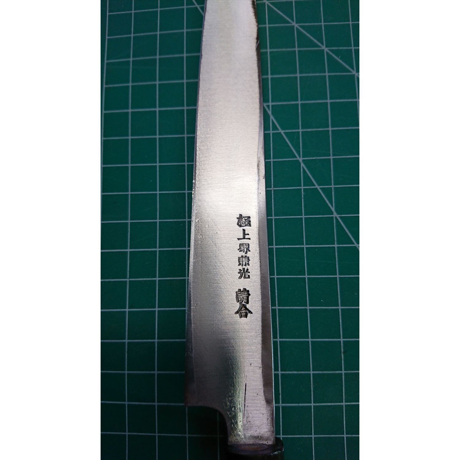 1. o1677/銘:堺兼光/刺身包丁(片刃 右利き用)/刃長:200/峰厚 アゴ上:4/重量:98/作り:鋼 極上 請合/他: