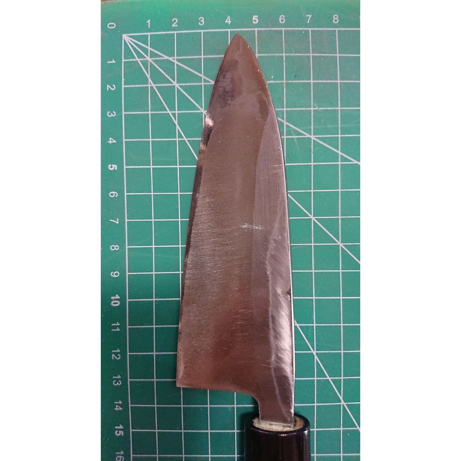 1. o1632/銘:?金?/出刃包丁(片刃 右利き用)/刃長:130/峰厚 アゴ上:5.8/重量:150/作り:鋼/他:柄は当社にて新品と交換済み