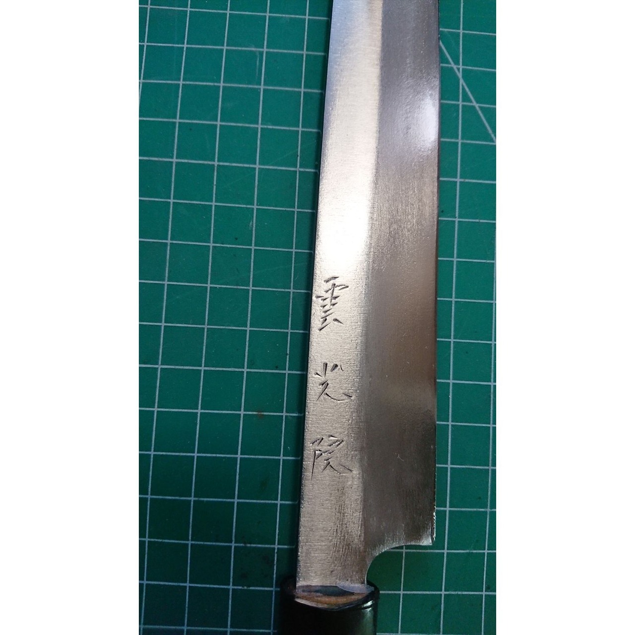 1. o1685/銘:奈良 菊一 雲光院/刺身包丁(片刃 右利き用)/刃長:280/峰厚 アゴ上:3.9/重量:152/作り:鋼/他:柄は当社にて新品と交換済み