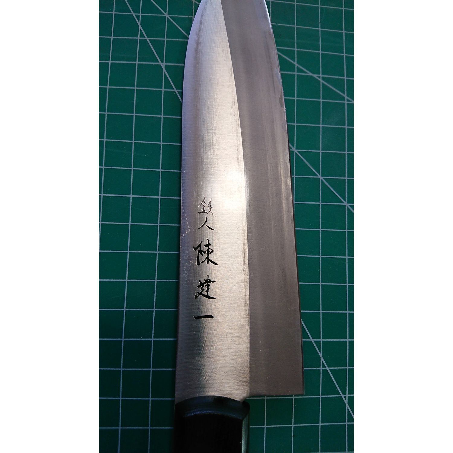 1. o1799/銘:鉄人 陳建一/三徳包丁(両刃 右利き・左利き兼用)/刃長:165/峰厚 アゴ上:1.7/重量:139/作り:ステンレス/他: