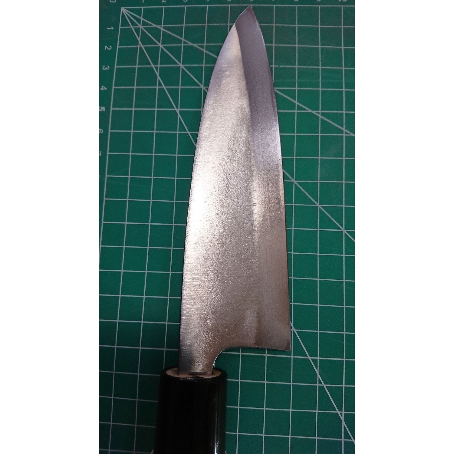 1. o1583/銘:?代の?/出刃包丁(片刃 右利き用)/刃長:145/峰厚 アゴ上:6.2/重量:161/作り:鋼/他:柄は当社にて新品と交換済み