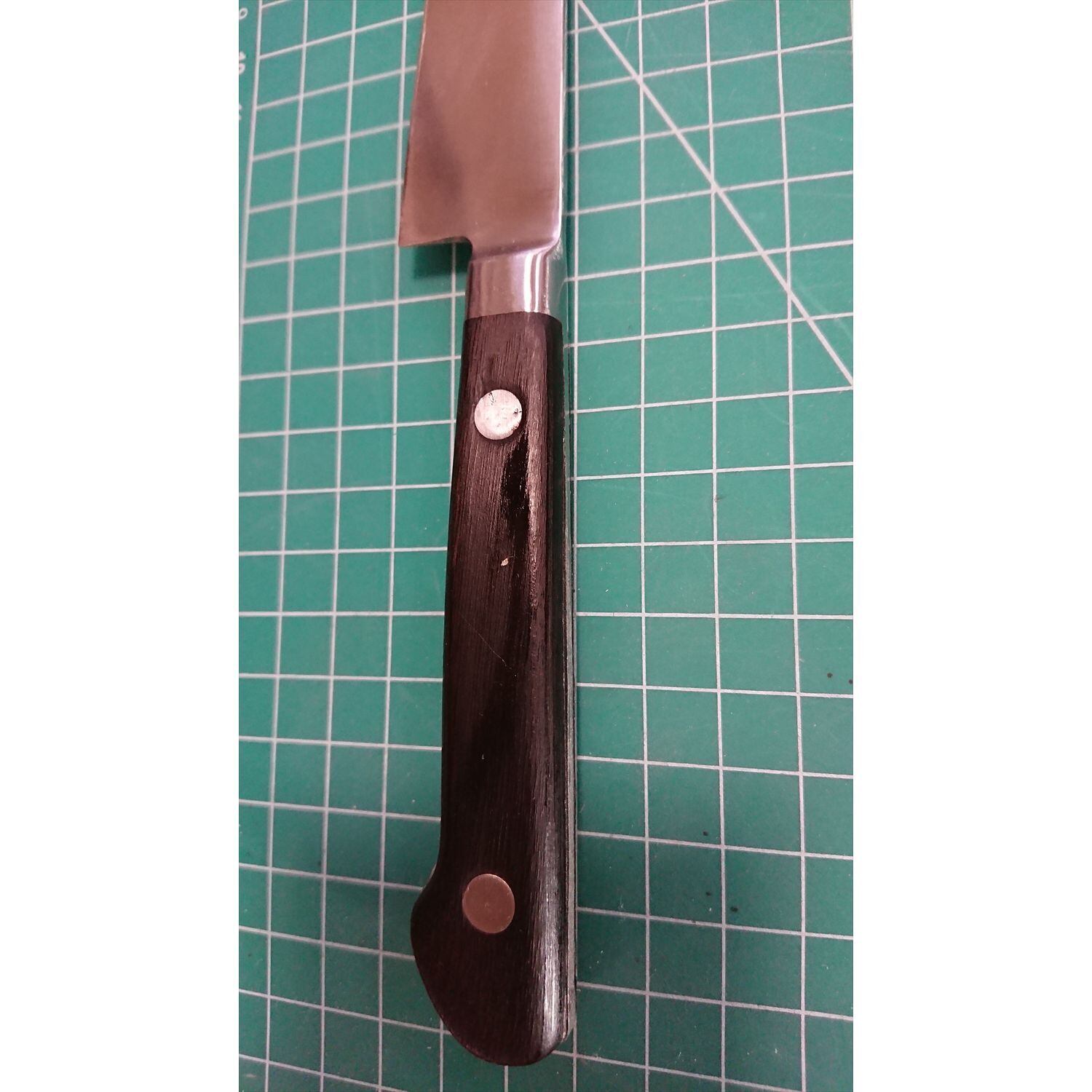 1. o1782/銘:有次/ペティナイフ(両刃 約 左2:右8 右利き用)/刃長:145/峰厚 アゴ上:2.5/重量:102/作り:鋼 上/他:柄と中子の間に少々スキマがあったので当社にて補修済み