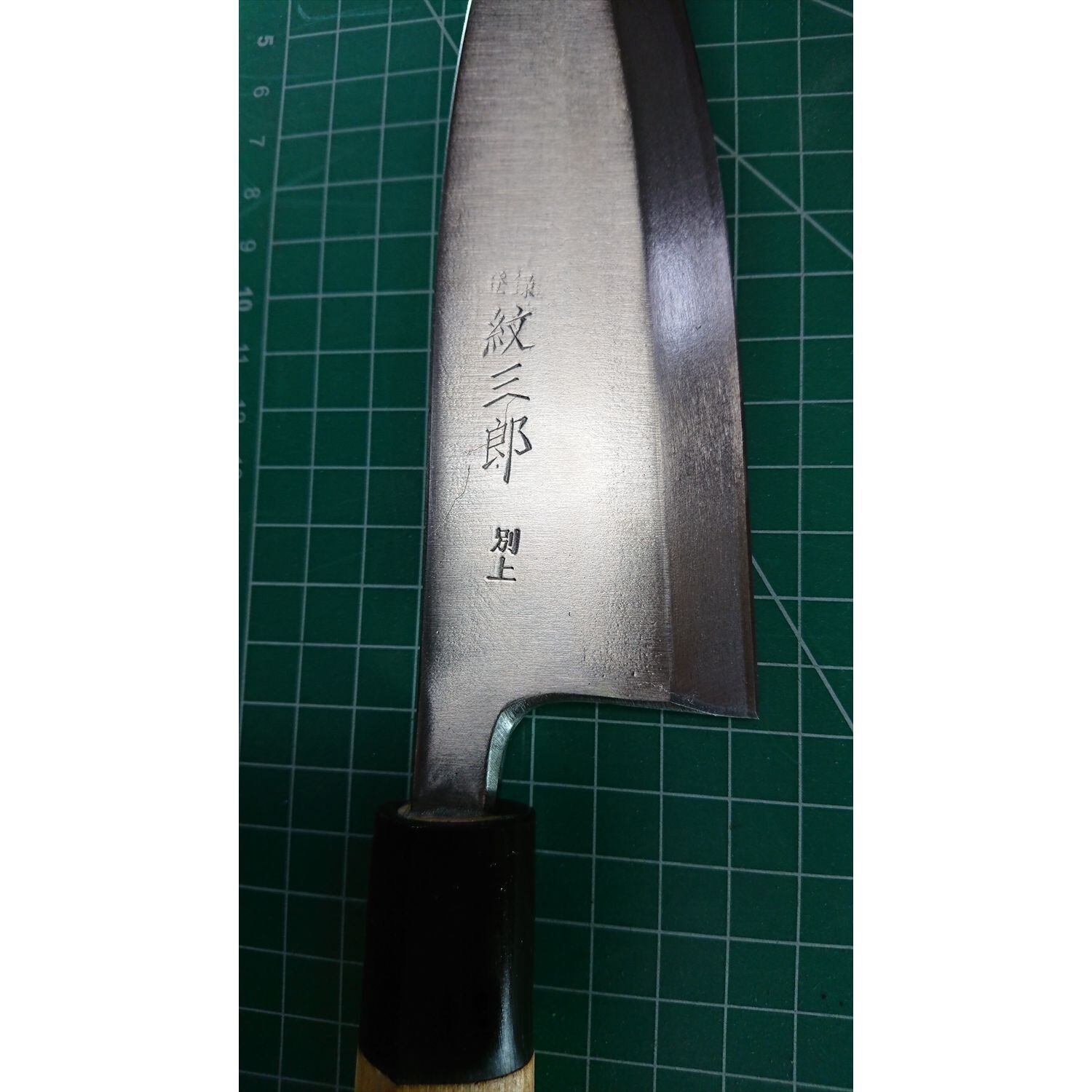 1. o1778/銘:紋三郎/出刃包丁(両刃 約 左1:右9 右利き用)/刃長:165/峰厚 アゴ上:7.3/重量:287/作り:別上 安来鋼(安来白三鋼) 水牛柄/他:柄に一部虫食いがあったが当社にて補修済み。本職向