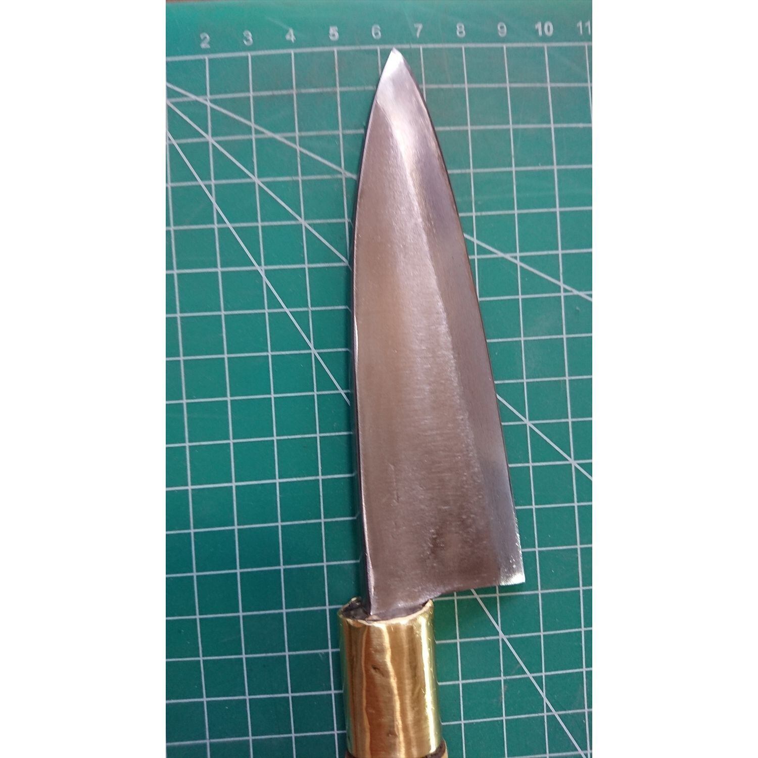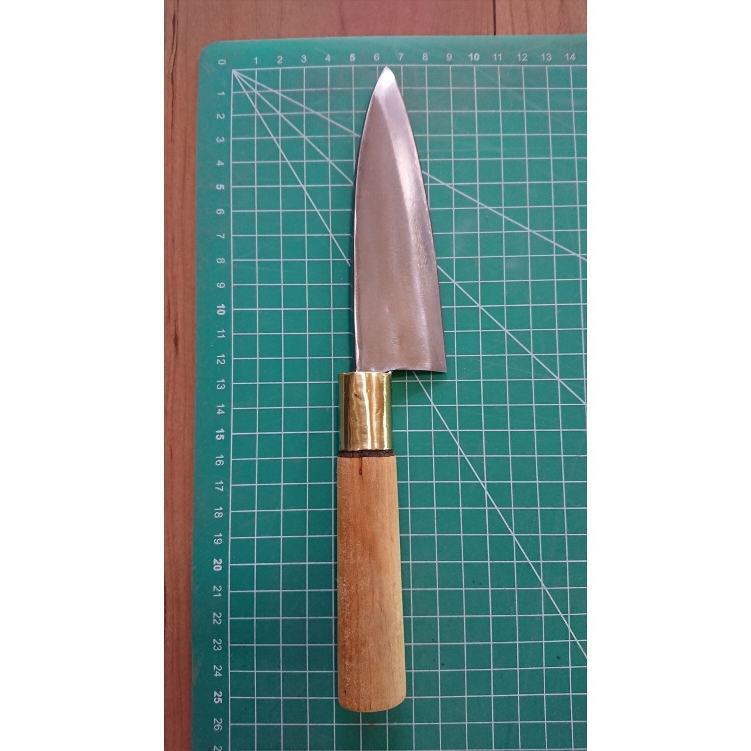 1. o1741/銘:東萬/出刃包丁(両刃 約 左1:右9 右利き用)/刃長:125/峰厚 アゴ上:5.6/重量:125/作り:鋼/他:銘はクリーニングにてほぼ消失