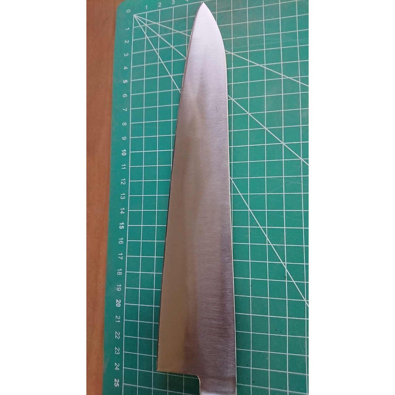 1. o1761/銘:E-pro/牛刀(両刃 右利き・左利き兼用)/刃長:235/峰厚 アゴ上:2.4/重量:227/作り:molybdenum/他:銘はクニーニングにてほぼ消失