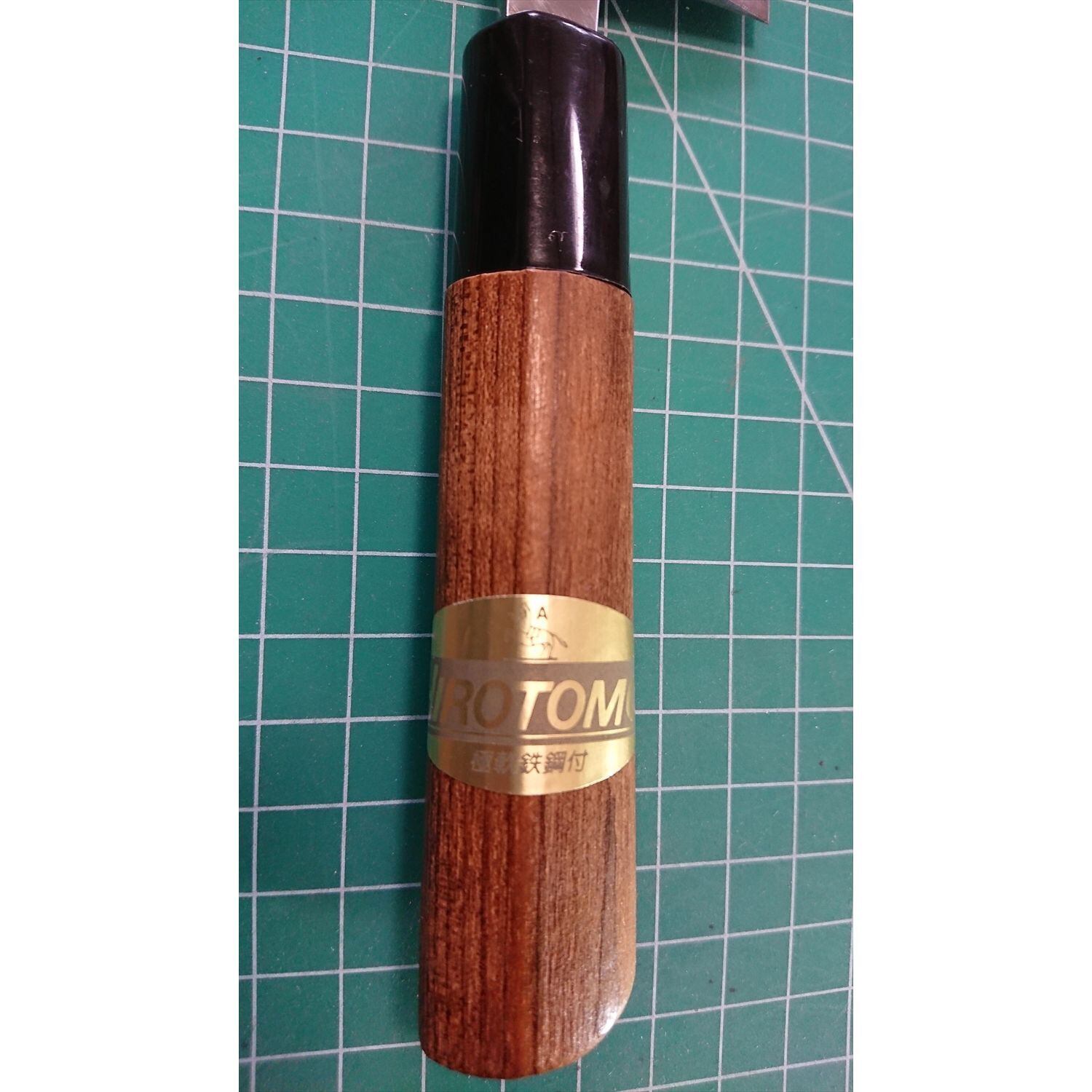 1. o1845/銘:廣朋/あじ切り包丁(片刃 右利き用)/刃長:105/峰厚 アゴ上:4.4/重量:98/作り:鋼 柄は黒檀の積層強化木/他:シールを残す為、柄は未クリーニング