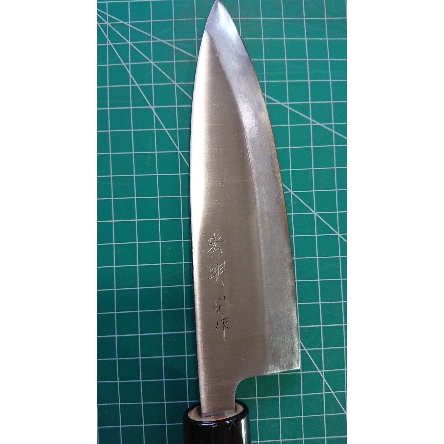 1. o1843/銘:宏明/出刃包丁(片刃 右利き用)/刃長:165/峰厚 アゴ上:8.3/重量:305/作り:鋼 別作/他:柄は当社にて新品と交換済み。本職向
