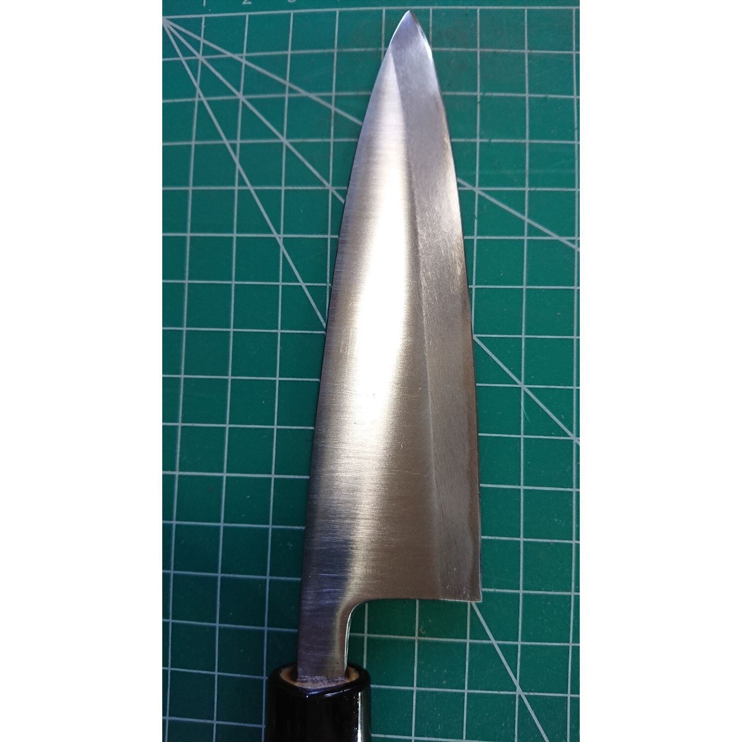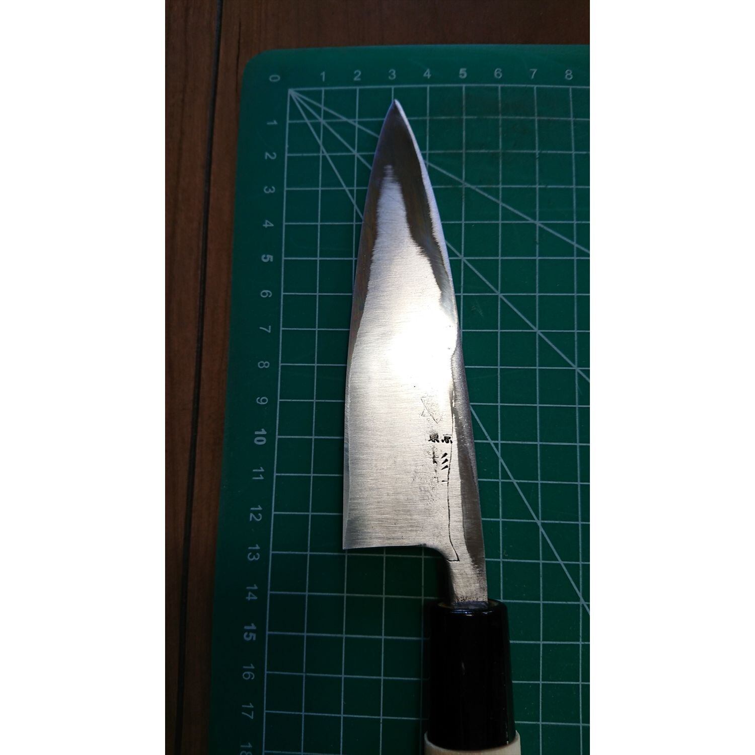 1. o1852/銘:東京杉本?/あじ切り包丁(片刃 右利き用)/刃長:120/峰厚 アゴ上:5.8/重量:107/作り:鋼/他:柄は当社にて新品と交換済み