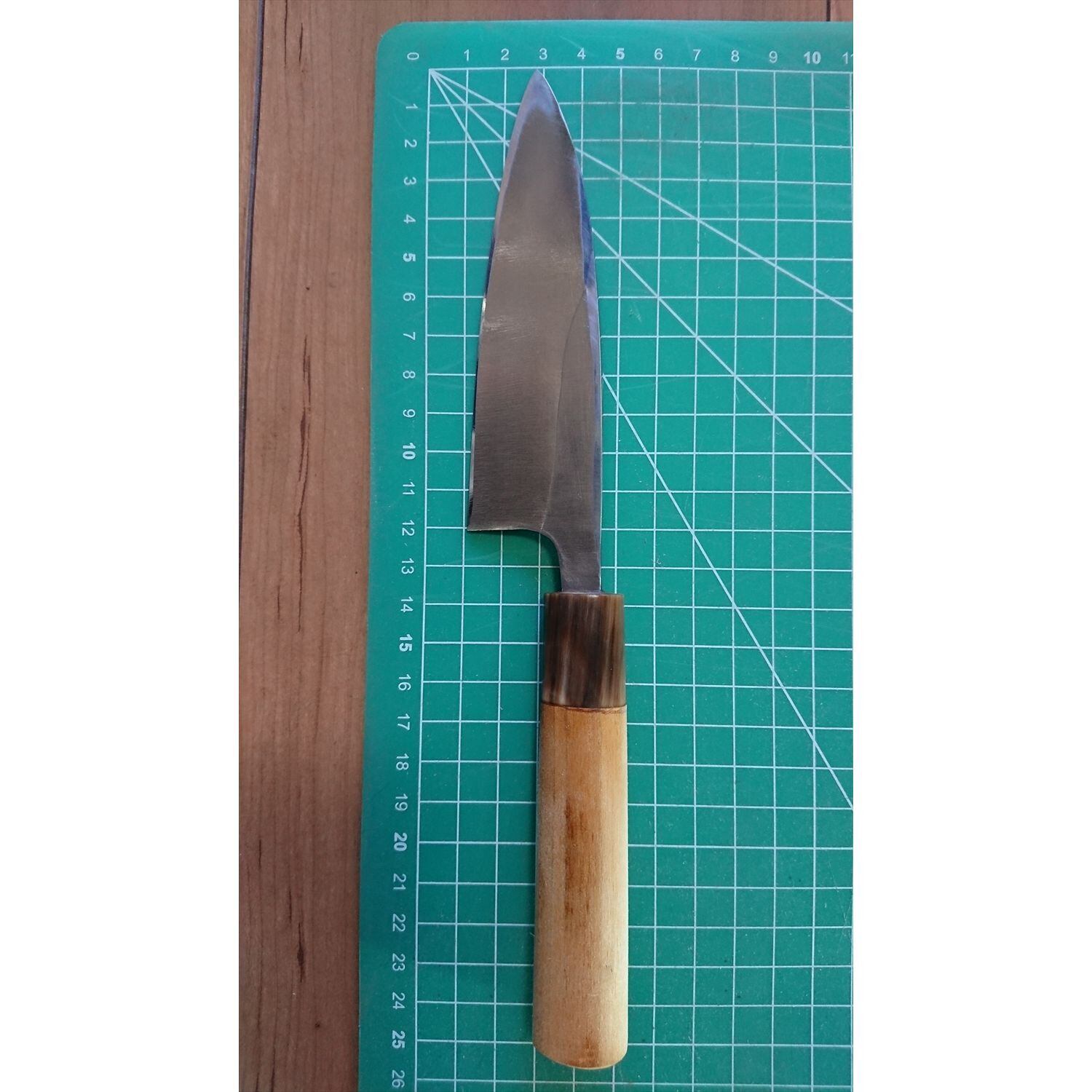 1. o1895/銘:有次/出刃包丁(片刃 右利き用)/刃長:120/峰厚 アゴ上:5.4/重量:109/作り:鋼 水牛柄/他: