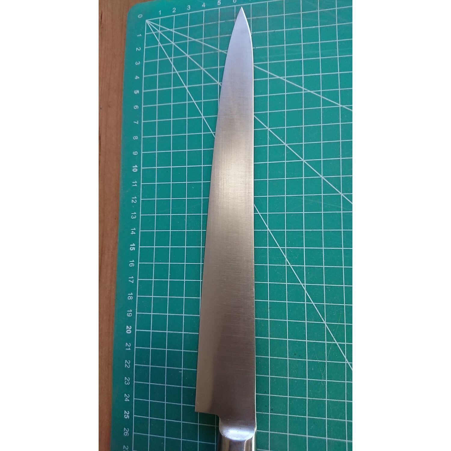 1. o1967/銘:銘?/筋引包丁(両刃 約 左1:右9 右利き用)/刃長:240/峰厚 アゴ上:2.1/重量:166/作り:ステンレス系?/他:本職向。ツバに「幸」と彫りあり