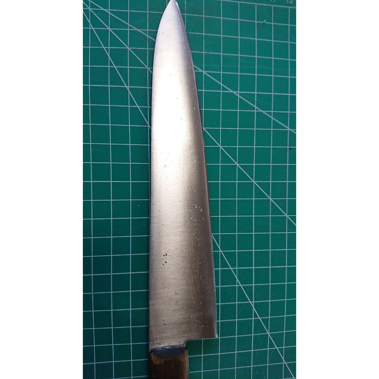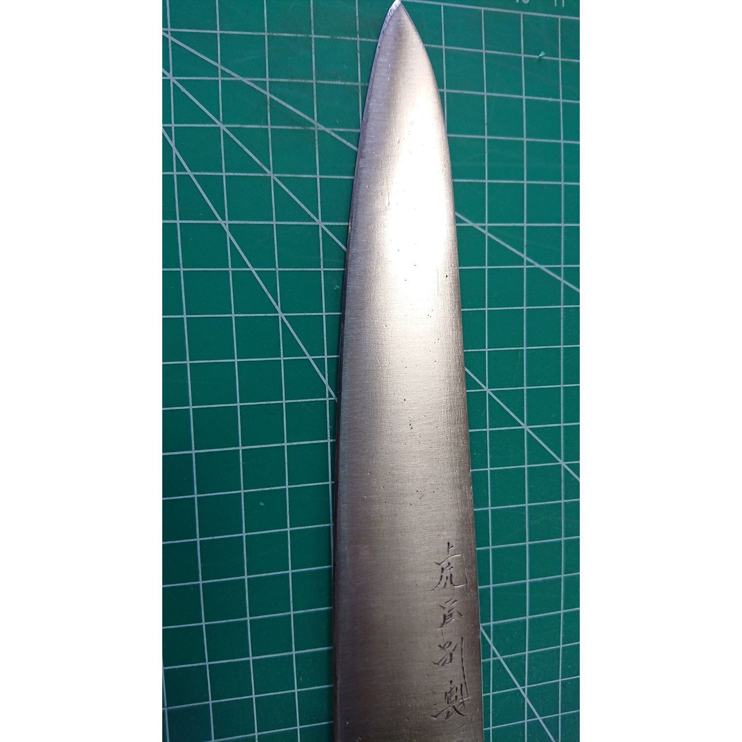 1. o1963/銘:虎屋別製/牛刀(両刃 右利き・左利き兼用)/刃長:185/峰厚 アゴ上:1.3/重量:94/作り:割込鋼(鋼をステンレスでサンド)/他:柄と中子の間に少々隙間があったが当社にて補修済み
